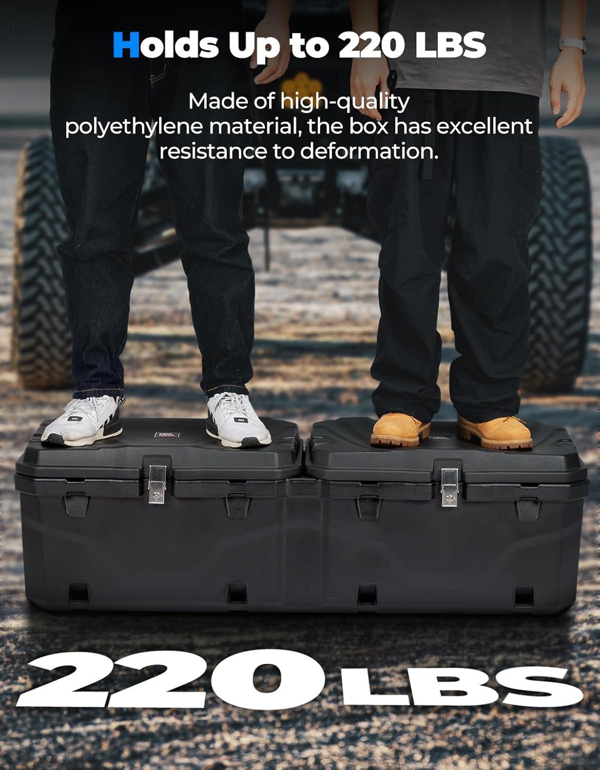 Waterproof & High-Quality: Our UTV bed toolbox is made from high-quality polyethylene material, ensuring durability and longevity. Its waterproof lid design keeps your belongings safe and dry, even in the harshest weather conditions. Store your gear with confidence