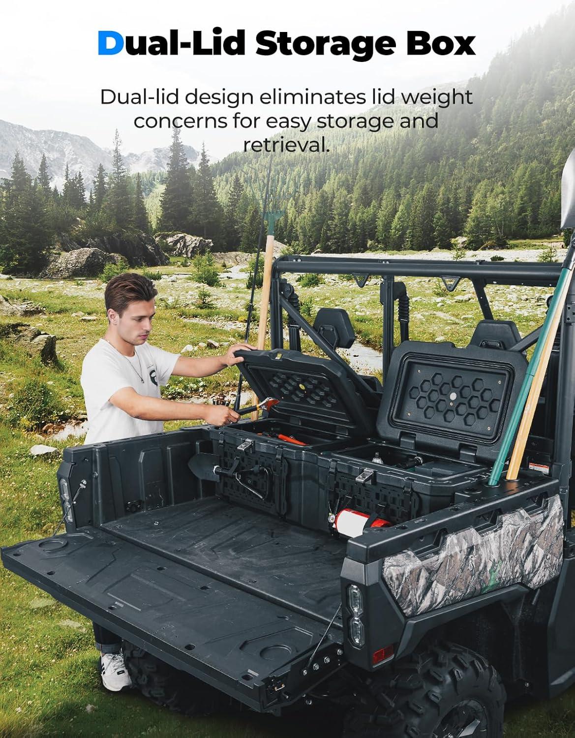 Lockable Cargo Box: The lockable rear cargo box comes with keys, ensuring your items are well-protected when confidentiality is required, especially when the UTV is parked outdoors or left unattended