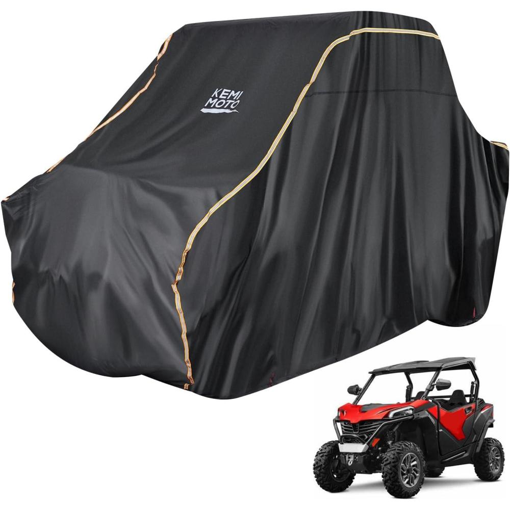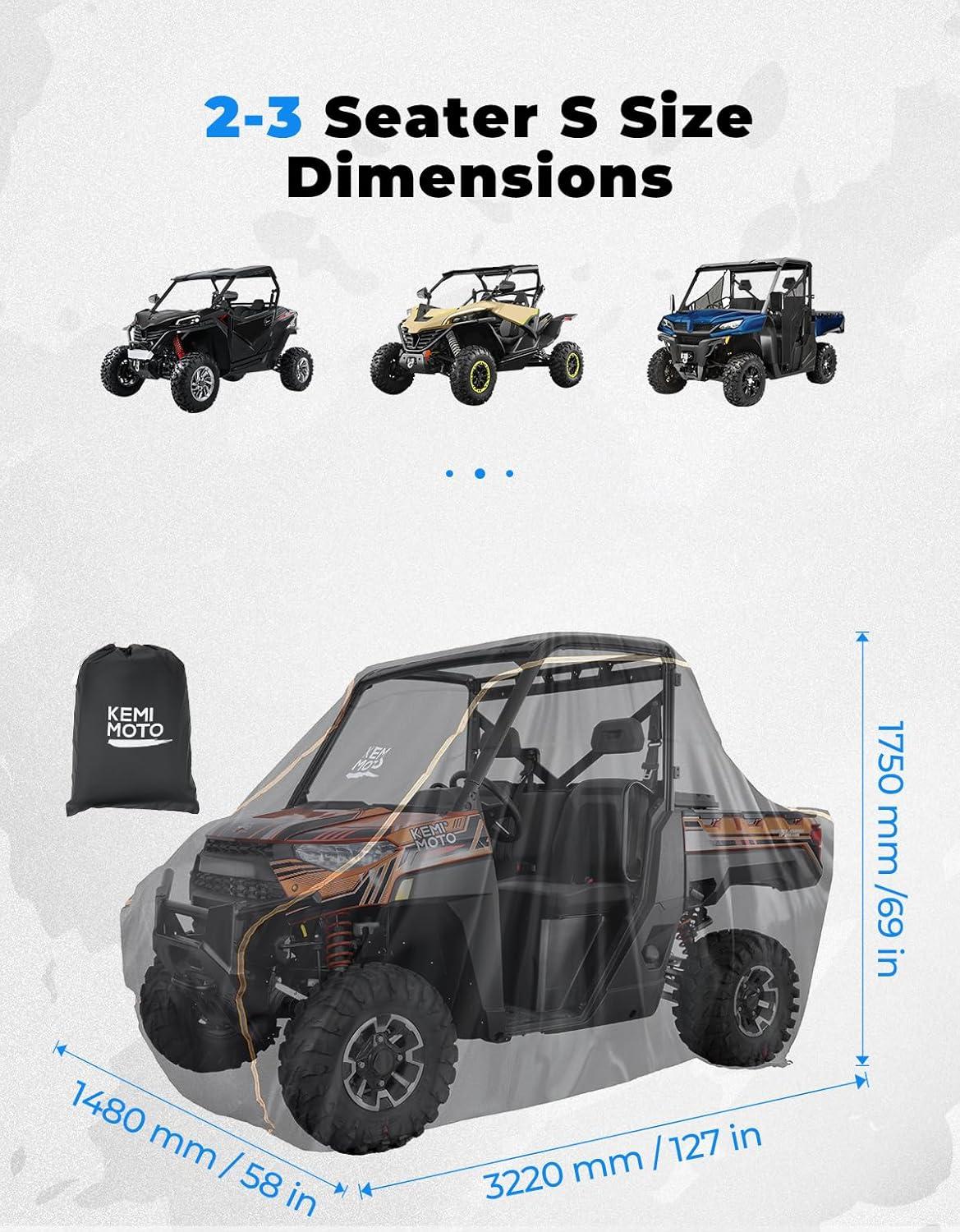 Medium Size for 2-3 Seater UTVs: Designed to accommodate 2 seater UTVs, our KEMIMOTO cover (dimensions: 124x58x71 inches) is compatible with Polaris Ranger XP 1000/ Mule/Pioneer/Wolverine/CFMOTO UForce/Defender/Massimo/Hisun/Axis/Coleman. Note: Not suitable for use during trailer transport