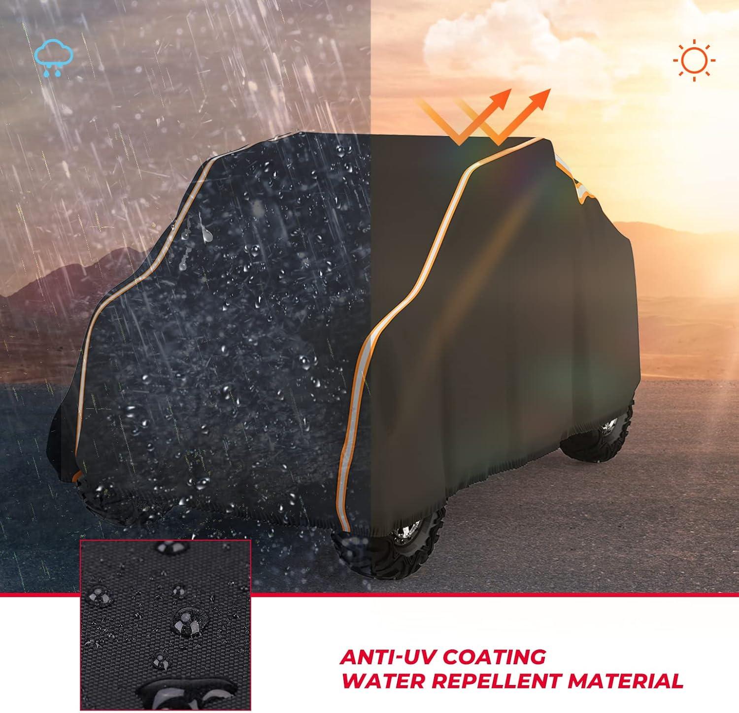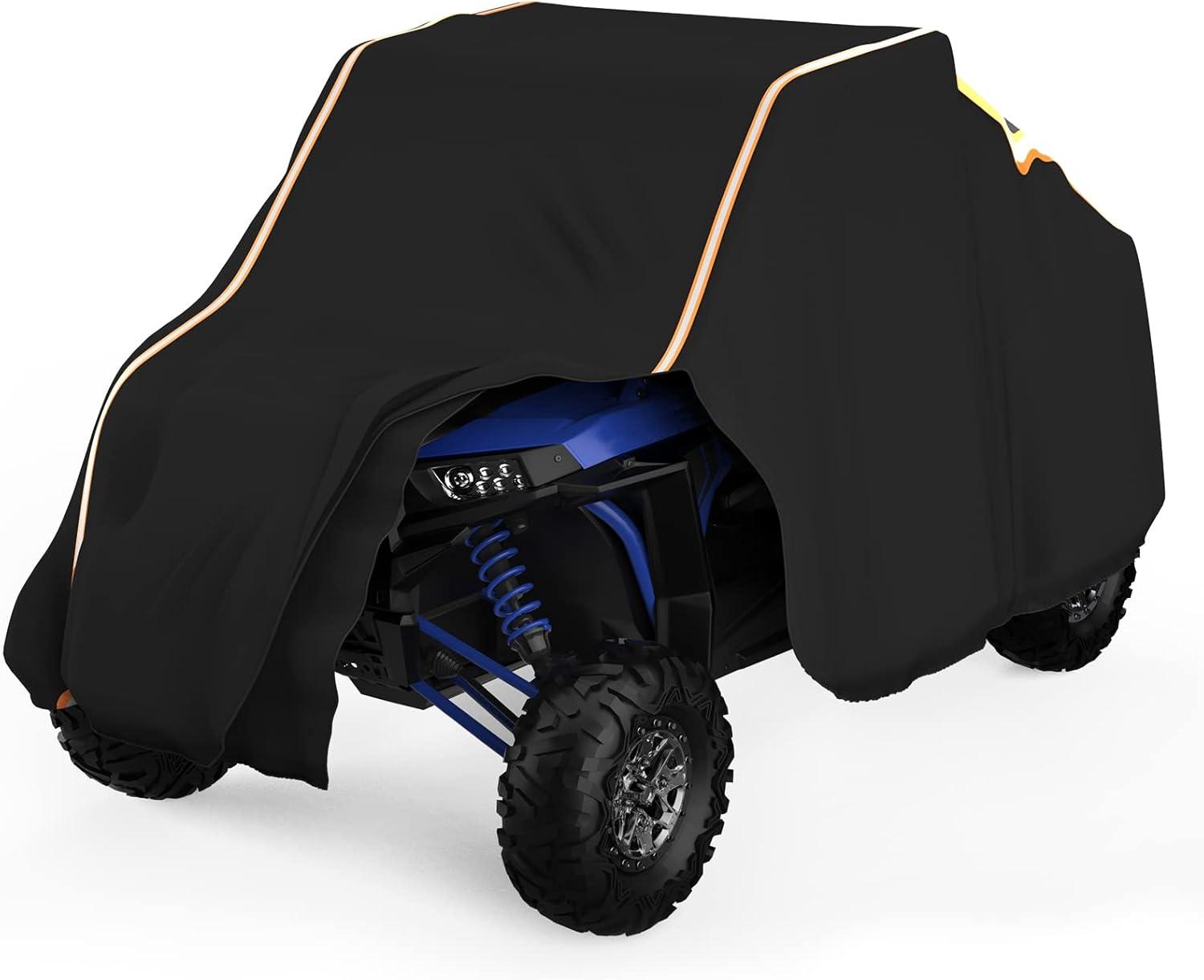 UTV Covers – Waterproof Oxford Cloth: Made with innovative heavy-duty polyester black Oxford cloth with waterproof PU coating and U V-Resistant coating in the backing, UTV storage cover is a highly flexible material and will not cause friction damage to the locomotive paint caused by the movement of the car. Side by side cover has four holes on each side, which can tie the cover to the four wheels and keep it in place when the wind blows