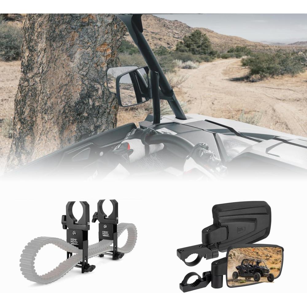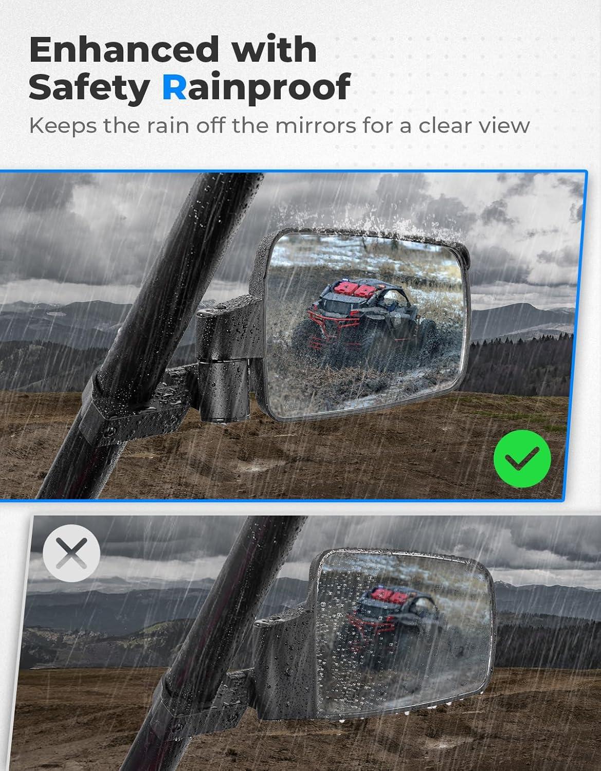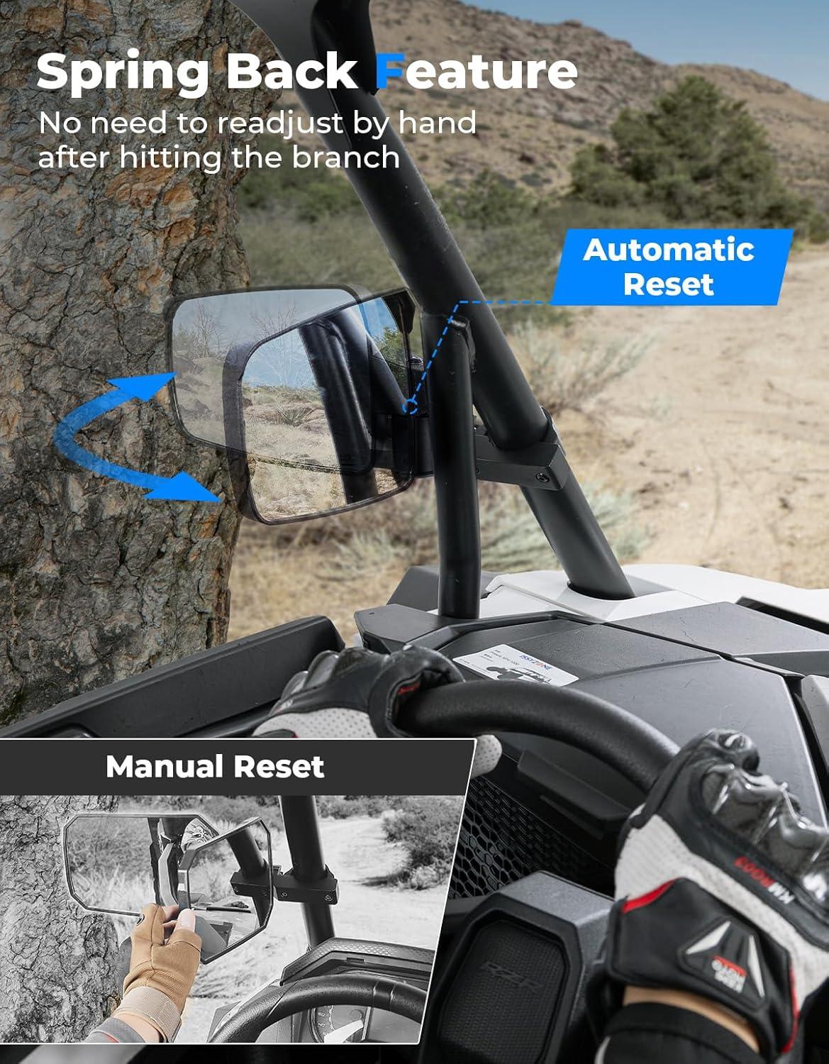 Spring Back Mirrors – Fit 1.65″-2″ Roll Bar: These mirrors fit most UTVs, compatible with Polaris RZR, Can-Am X3, Pioneer, Talon, Mule, and CFMOTO. But it does not fit Pro-fit models or outside 1.65-2 inches, and it is not compatible with Ranger, Defender, Pioneer 500/520/700, and ZForce 800/500