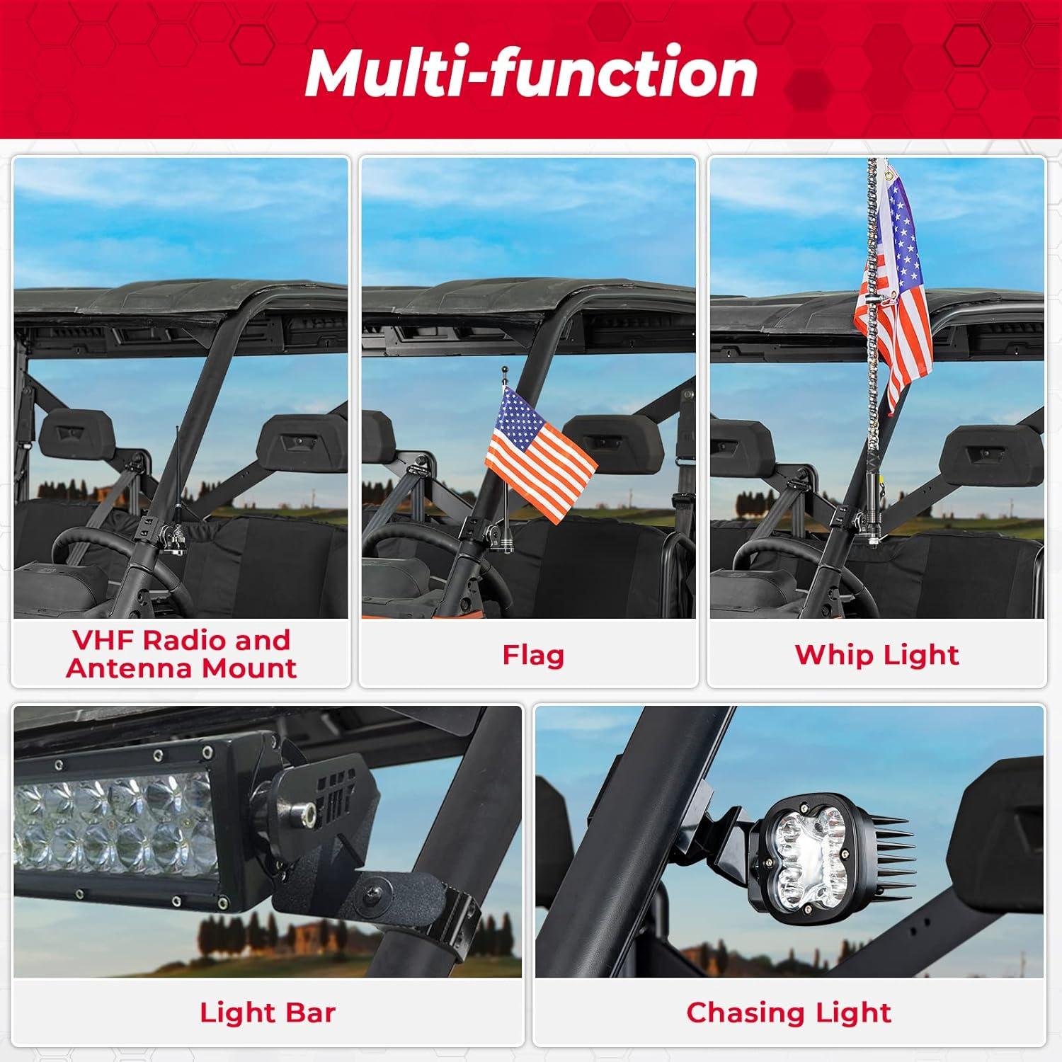 Multi-Function: Mounting a flag or whip light to your UTV will make you stand out from other riders wherever you are on the dune hill, track, or trail. But flag or whip light come in different styles, you may not be able to find the perfect spot to install it, so that is what the flag mounts for