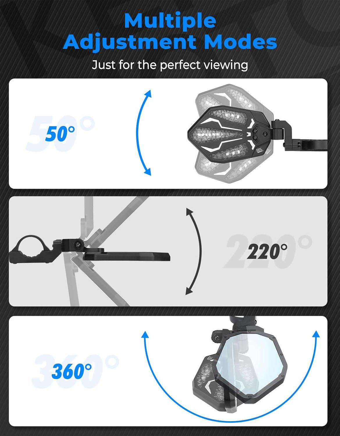 Adjust The Angle As Desired: Featuring a unique 30° adjustable mirror angle, these KEMIMOTO side-by-side (sxs) mirrors offer three adjustable positions. Simply loosen the bolt and lift the UTV side view mirrors up or down to meet your specific requirements. Additionally, the UTV side view mirrors are fully rotatable, allowing drivers to adjust them to their desired angle based on their height and reflect the rear view accordingly