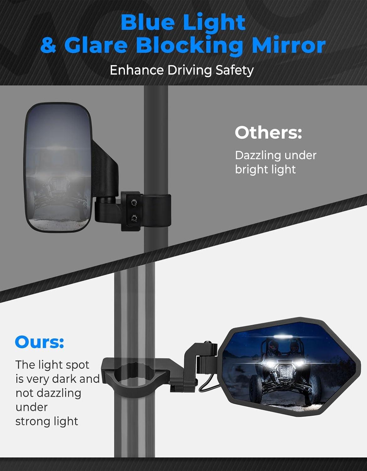 Replaceable Anti-Glare Glass: UTV Rear View Mirrors with anti-glare large field glasses, which won't shatter into sharp fragments and cause harm to your fingers upon breakage. Additionally, you can simply request a replacement glass instead of purchasing a whole new pair. In contrast to regular plastic shell mirrors available in the market, this mirror boasts a robust and long-lasting aluminum shell