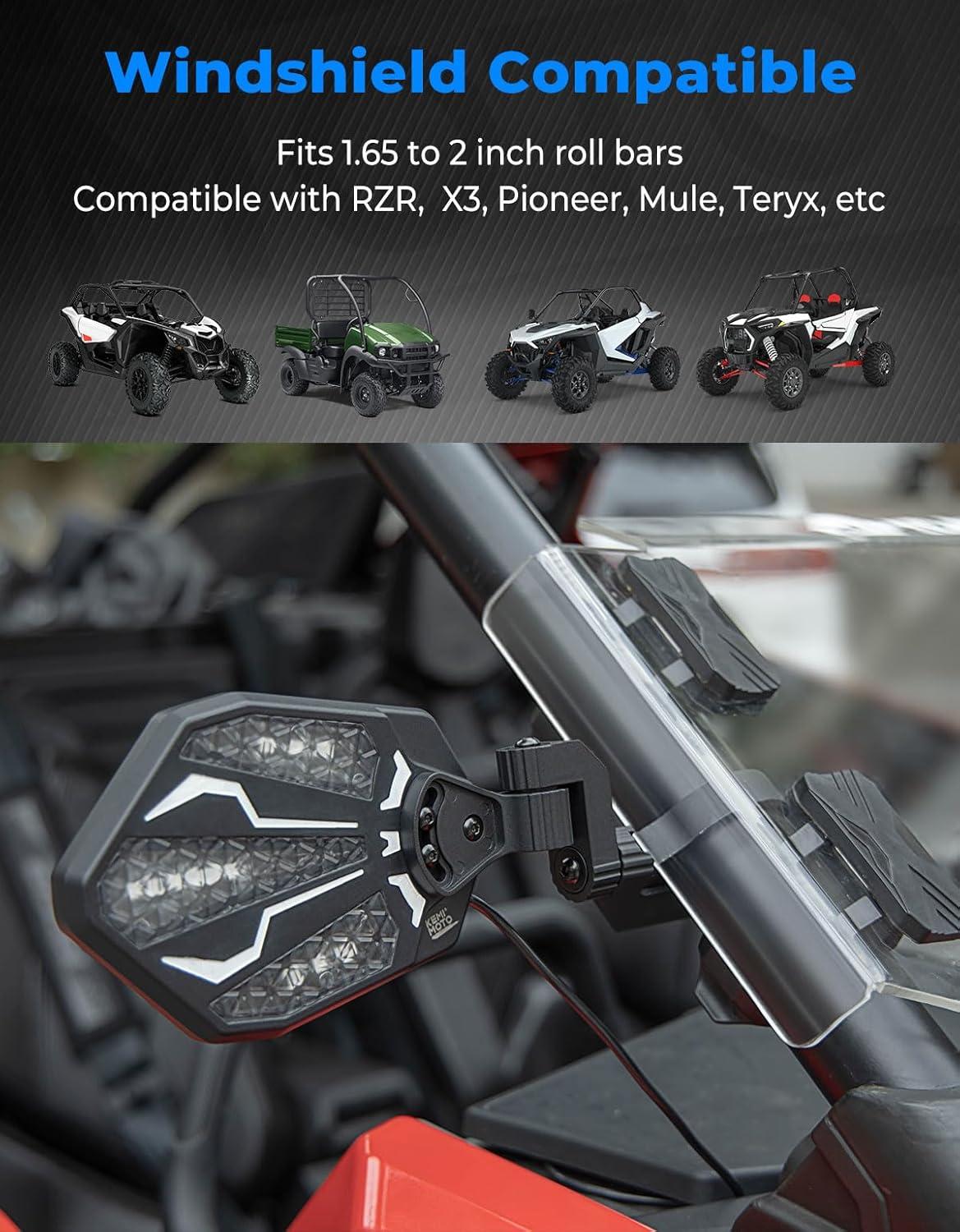 Wide Fitment: The Full Billet Aluminum Construction Mirrors universally fit 1.6″-2″ roll bars with windshields. Compatible with Polaris RZR XP 1000, PRO XP, Can-Am X3, Maverick, Kawasaki Mule 600, 610, Teryx KRX 1000, Rhino, CFMoto ZFORCE, Talon, Pioneer 1000, Massimo Axis 500