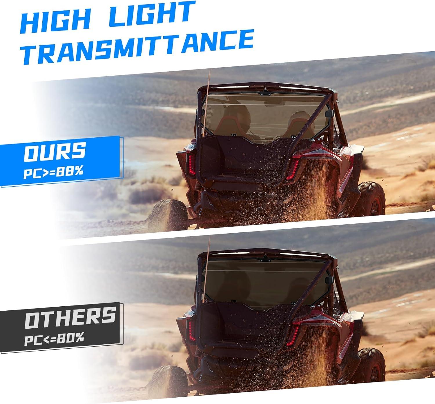 【1/4″ Polycarbonate Material】The UTV rear windshield is constructed from hardened PC material, making it significantly more shatter-resistant compared to other glass alternatives on the market