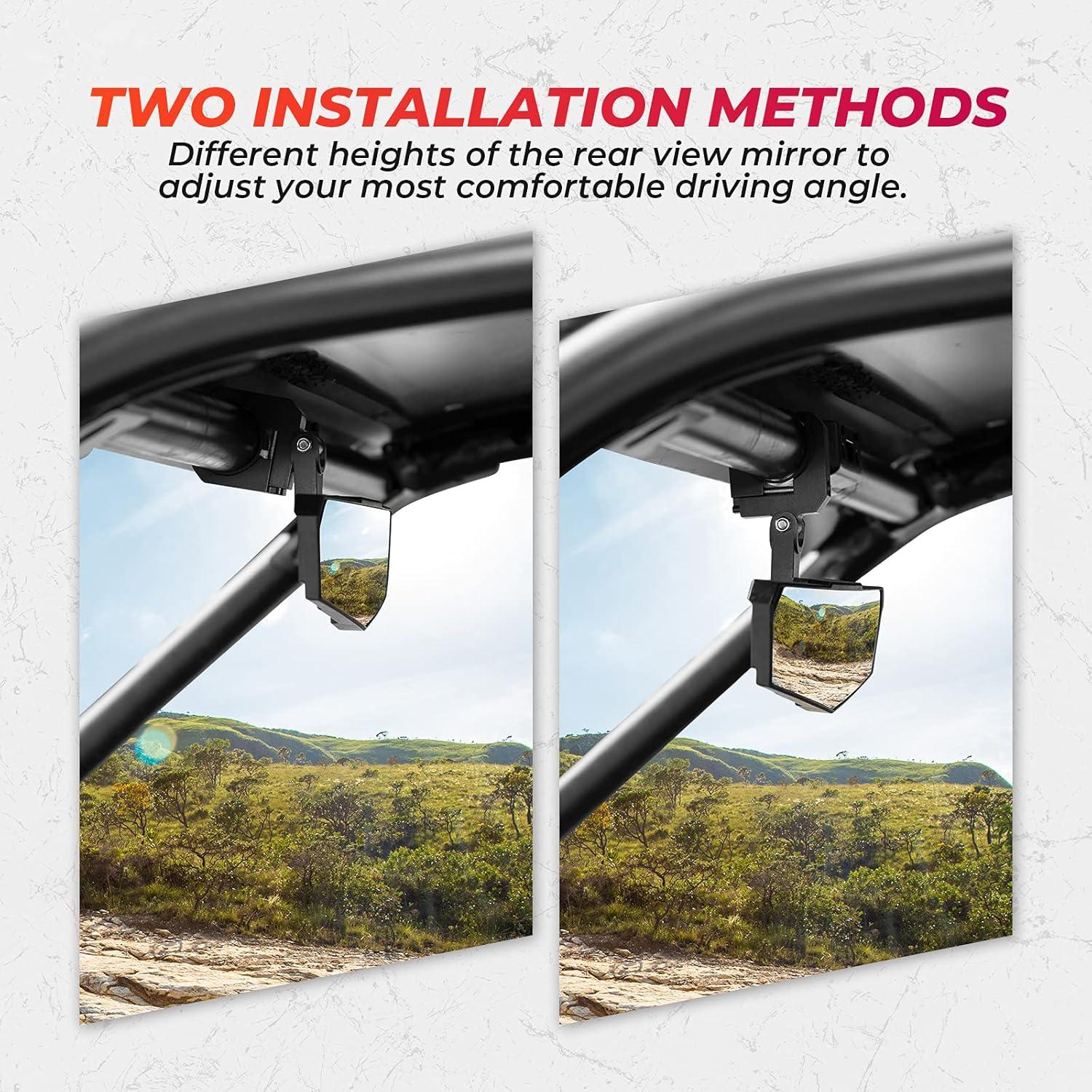 Better Driving Experience: The KEMIMOTO UTV center mirror mount has two installation methods, which can be adjusted in different ways according to your height. You no longer have to worry about being uncomfortable looking at the vehicle behind you during driving. At the same time, the low profile clamp design allows the UTV rear mirror to be windshield and roof compatible, maximizing the upgrade of your UTV.