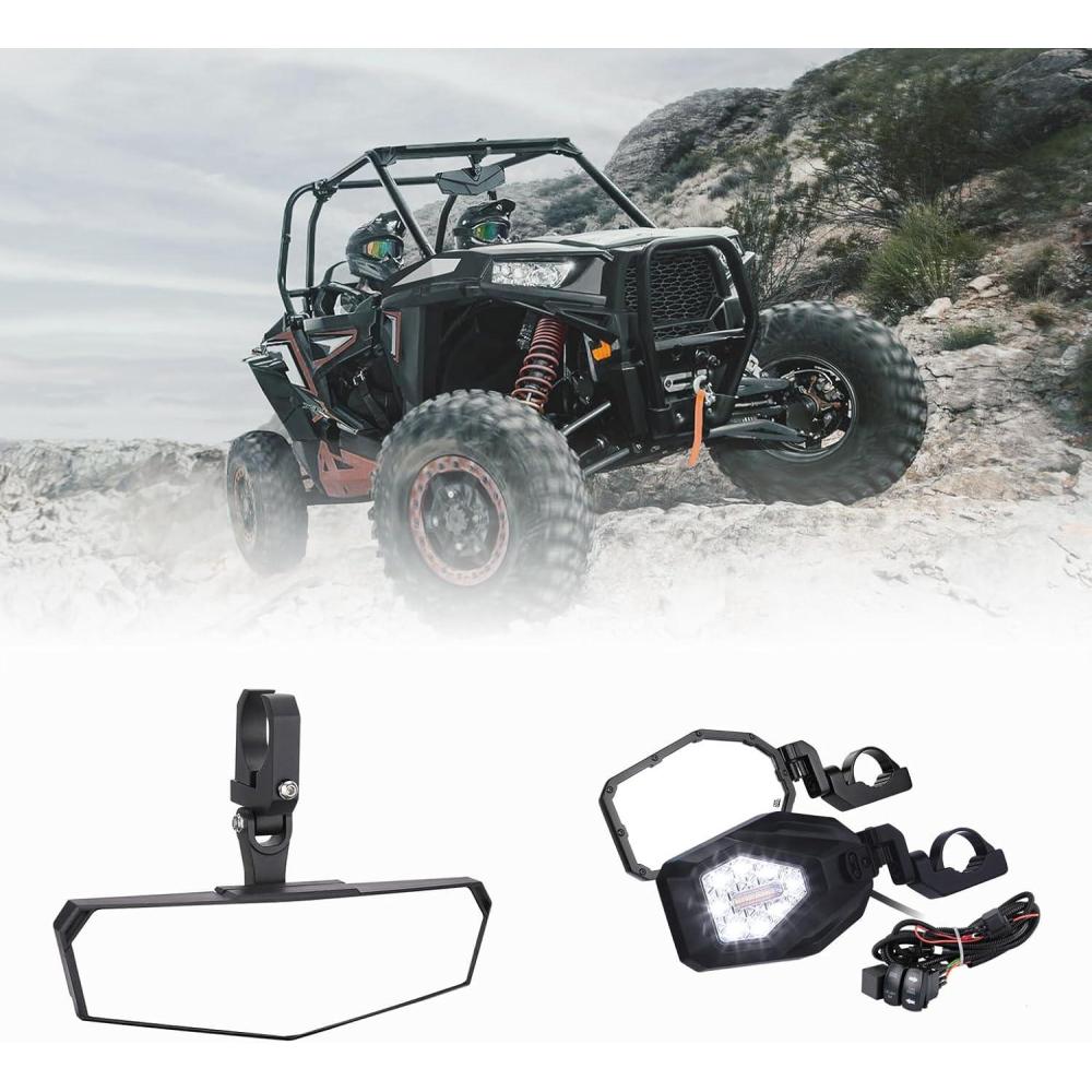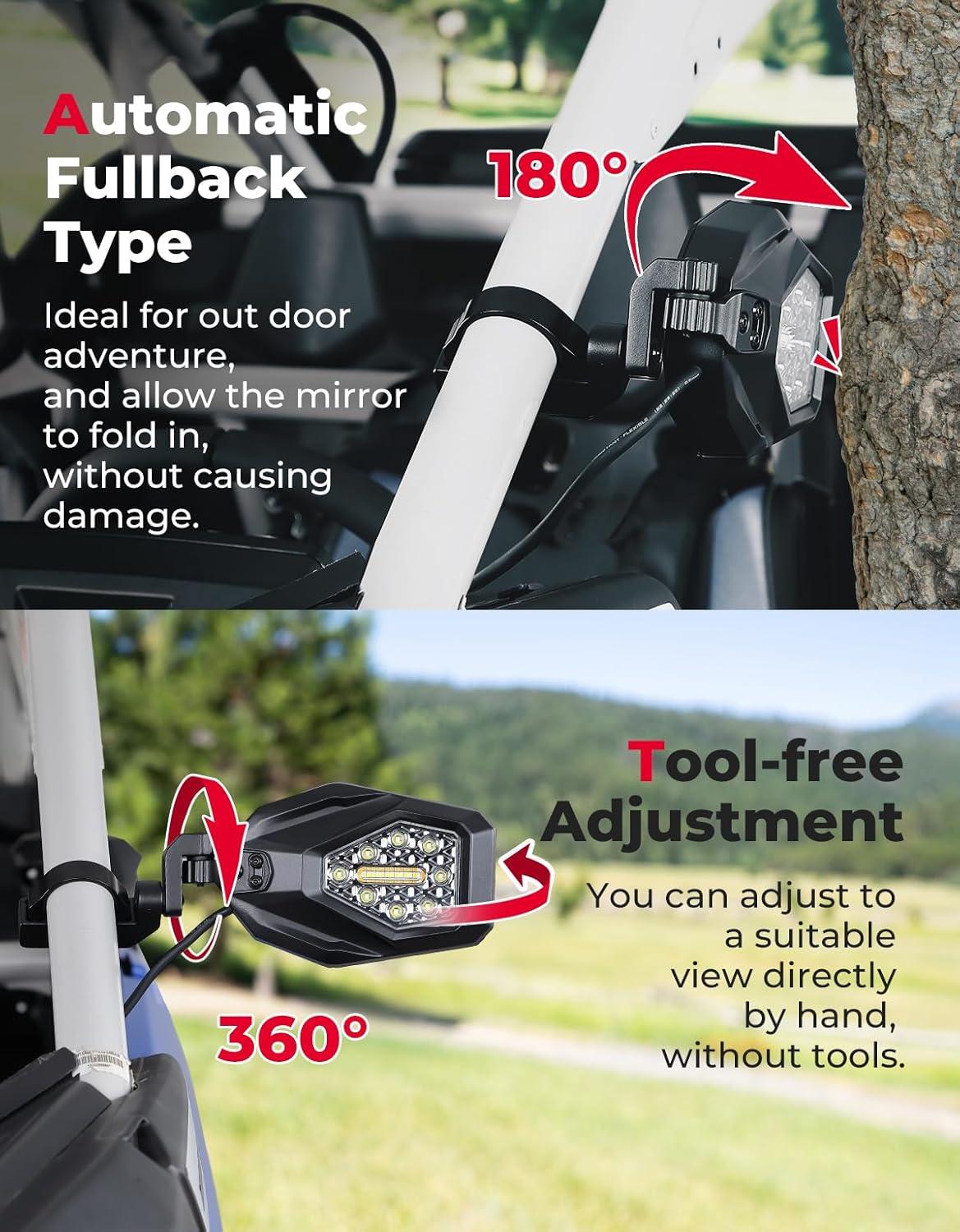 Unique Turn Signal Light And Spotlight – KEMIMOTO UTV side mirrors with lights not only provide two additional night vision spotlights but also offer two amber-flowing turn signal lights, enhancing safety on the road. They greatly enhance night vision and driving ability at night, while the eye-catching lights ensure you stand out in the crowd.