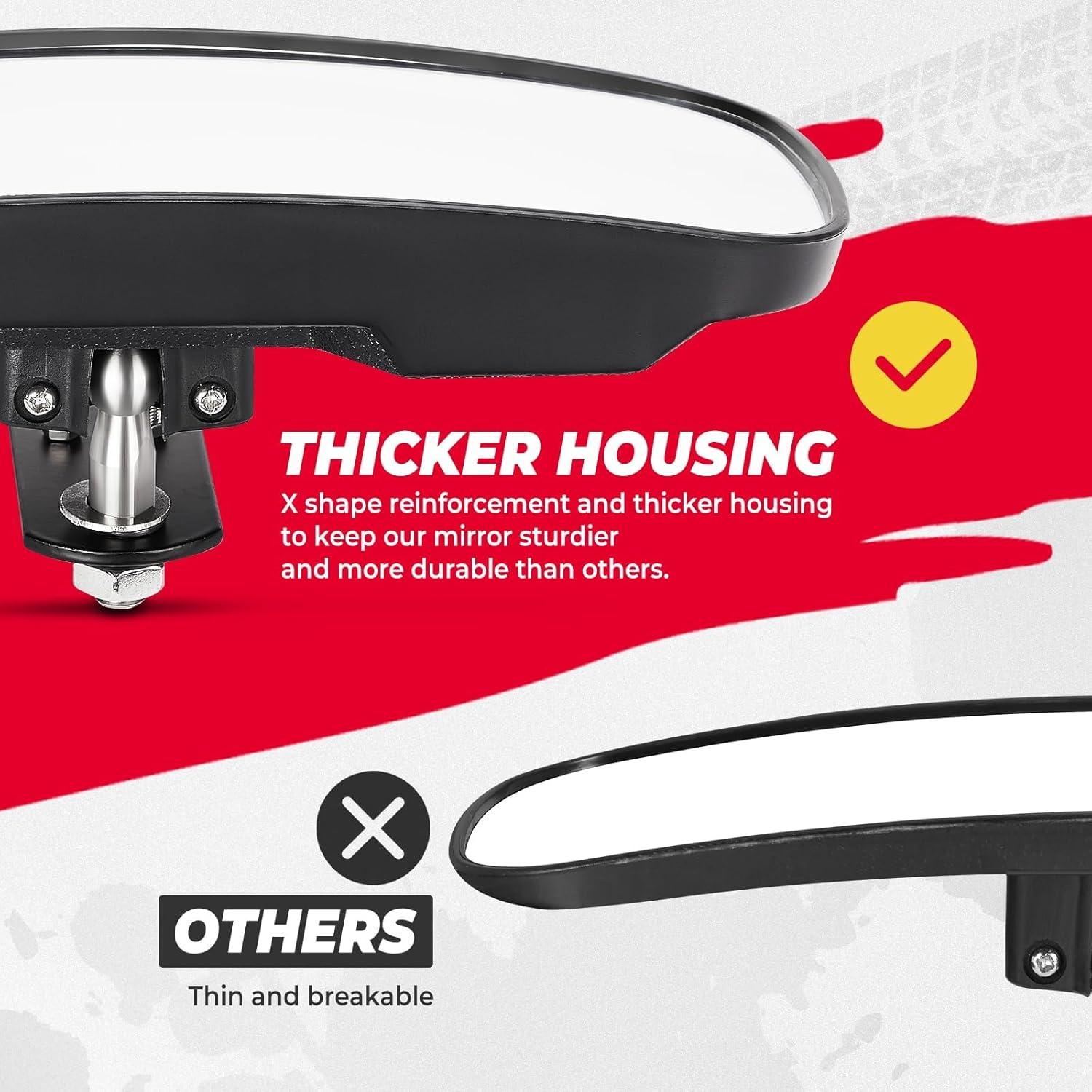 Strong Material for UTV Rear View Mirror: The center rearview mirror glass is made of safety glass designed to increase its strength compared to standard glass. Its ABS housing makes it impact- and shatter-resistant. Unlike plate glass, which shatters into sharp shards when broken, it crumbles into tiny granular pieces that are less dangerous