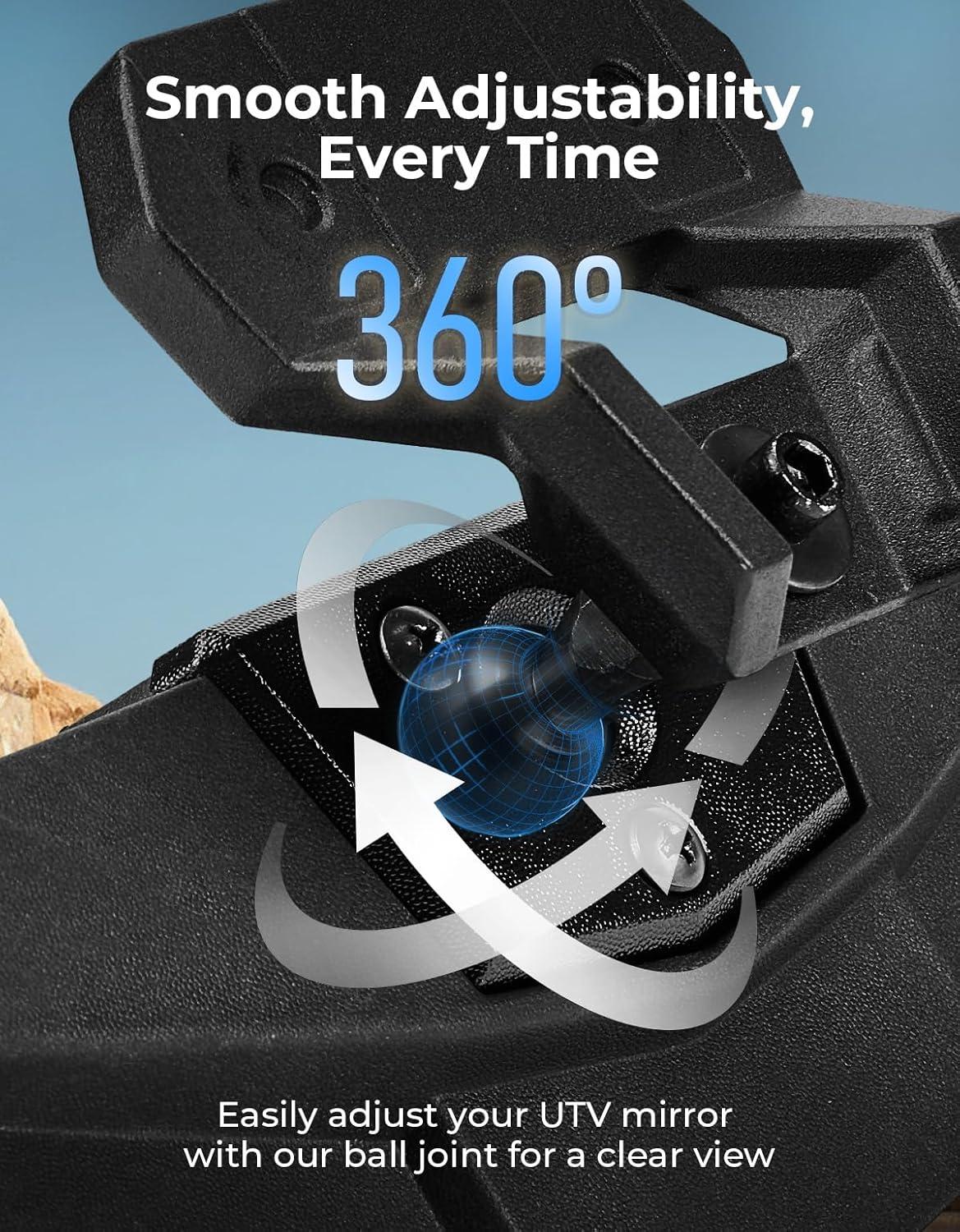 Accompany You Adventures: The UTV mirror features a high-quality ABS shell and an aluminum alloy bracket, staying stable even at racing speeds. SXS adjustable rear view mirror is corrosion resistant and great for all weather conditions. The reliable KEMIMOTO utv rearview mirror accompanies you over mountains and desert and still remains as bright as new