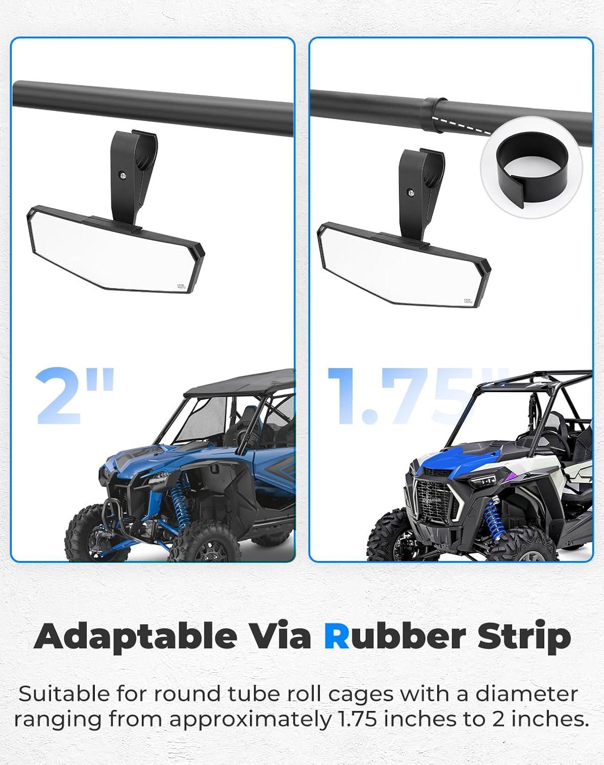 Broad Compatibility: The KEMIMOTO UTV rear view mirror fits almost any UTV with a 1.75″ to 2″ roll bar. A rubber mat is needed when installing the mirror on a 1.75″ roll bar. This SXS rearview mirror is compatible with Talon/Pioneer, Mule/Teryx, Polaris Ranger 500/800/570 Full-Size, PRO XP, RZR Turbo/Trail/1000/900, Can-Am X3/Maverick/Commander, Rhino/Viking/Wolverine/YXZ 1000, John Deere and Bobcat