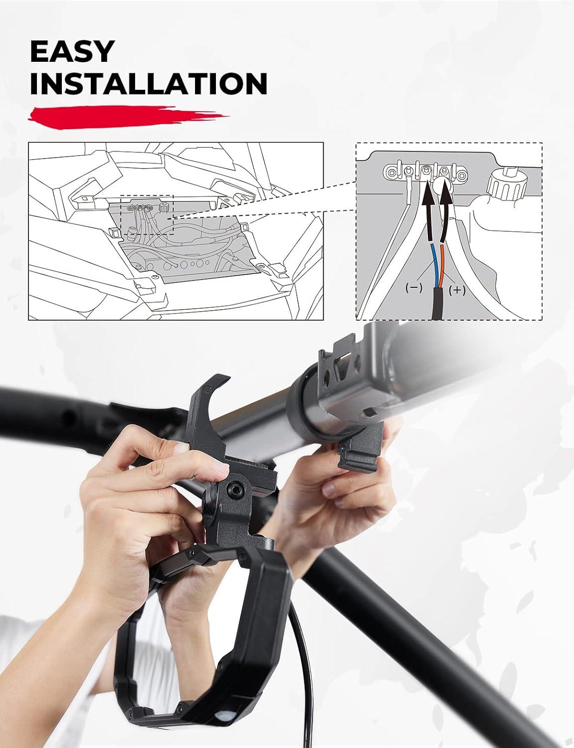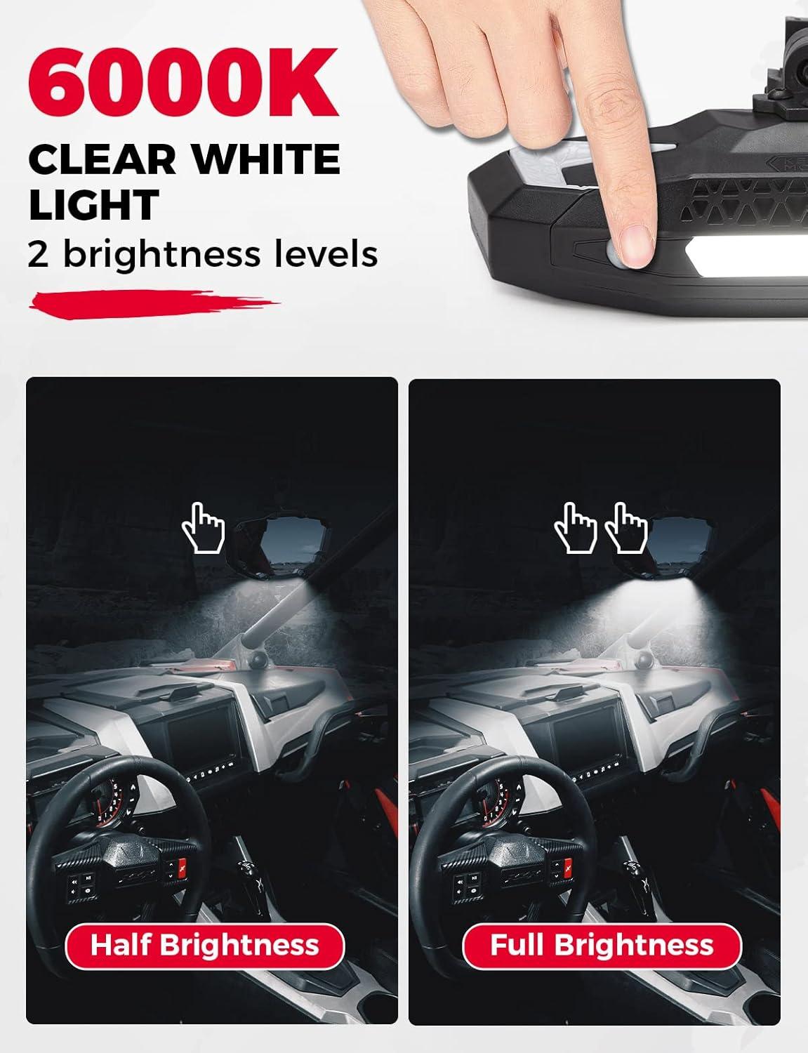 Incredibly Bright: Our UTV center mirror features a high-brightness LED light that consumes low energy, providing a clear and bright 6,000K white light view. The lamp is waterproof and dustproof, thanks to its innovative design. With two brightness levels, you can easily switch between lighting modes to suit your needs with just one push of a button