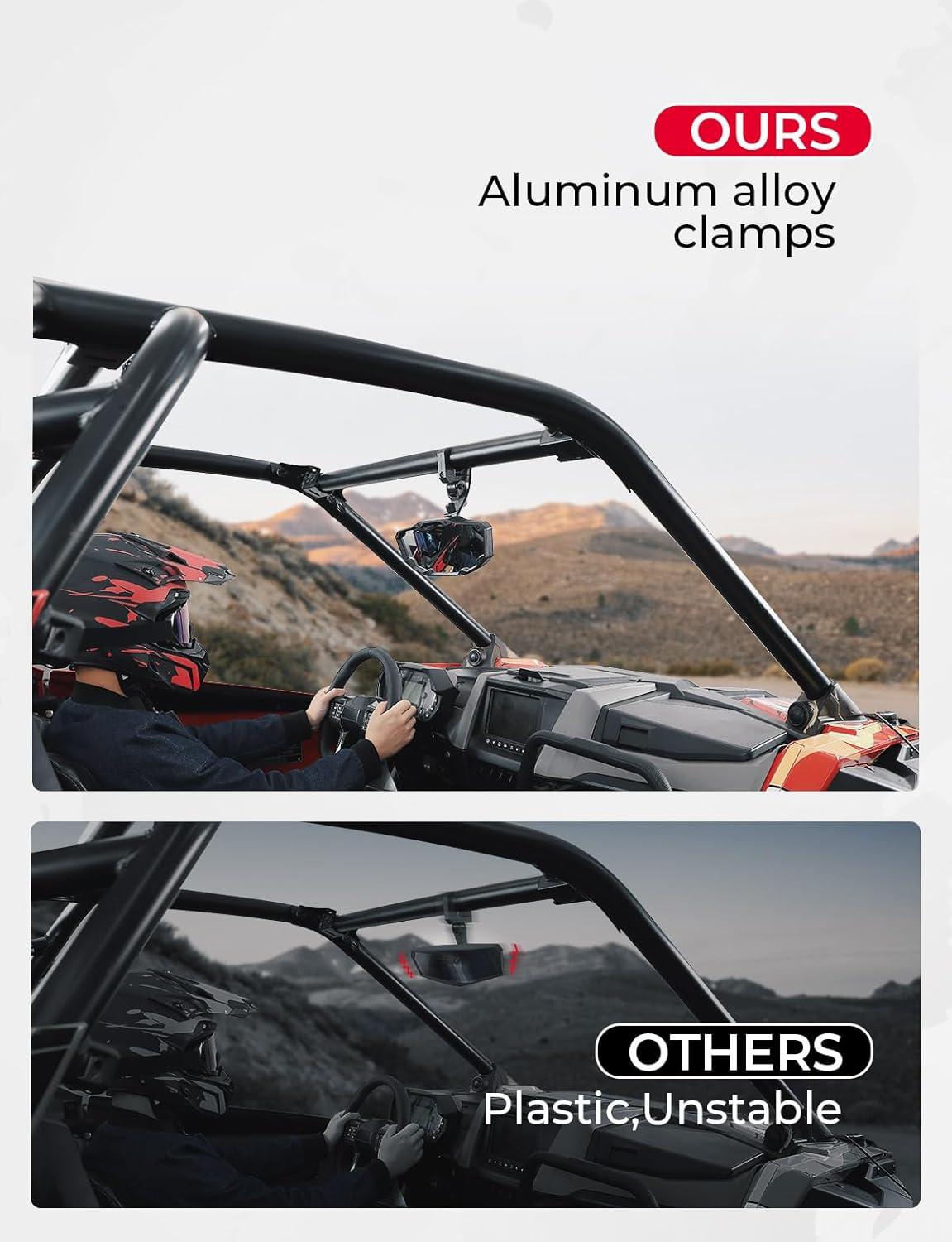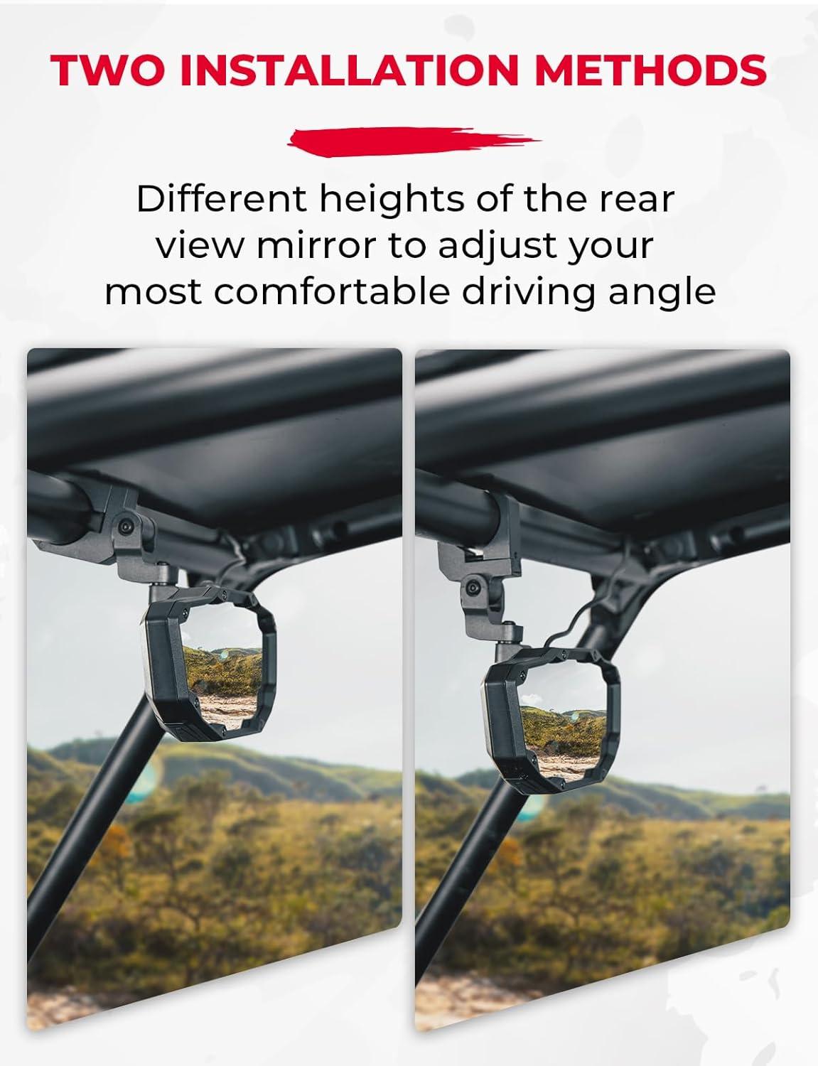 Compatible With Windshield and Roof: The UTV mirror is fit with 1.5 inch – 2 inch diameter round tube roll cages with the windshield and roof, making installation a breeze. It is compatible with Polaris RZR, Arctic Cat Wildcat, Pioneer, CFMOTO, Kawasaki Mule/Teryx, and more