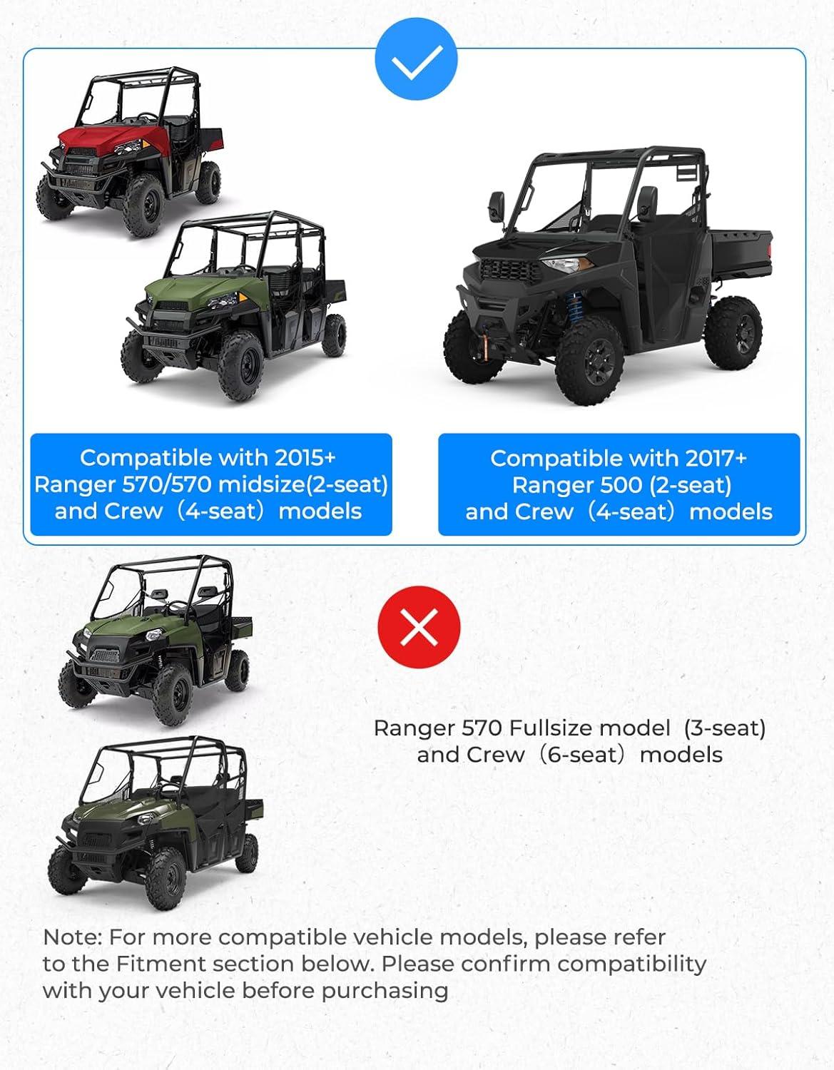 Fitment : The KEMIMOTO UTV windshield is compatible with 2015-2025 Polaris Ranger Midsize 570/SP 570/Crew 570/Crew SP 570/570 EPS/570-4/HD 570; 2017-2023 Ranger Midsize 500. Besides, also compatible with 570 INTL versions and certain years for the EV, ETX, and Commercial versions.(Note: DO NOT compatible with Ranger 570 500 full size models). Pls see more fitment details in the description