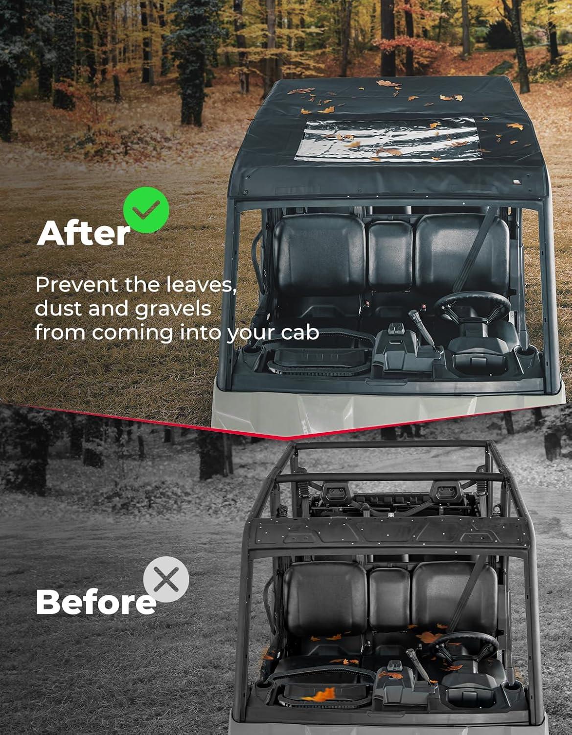 Clear Vision:The front of the roof is designed with a clear PVC sunroof that can be opened by rolling up the black sunroof cover, allowing you to fully enjoy the scenery around you and enjoy a wider view. The sunshade feature also helps to reduce glare and improve visibility during bright, sunny days