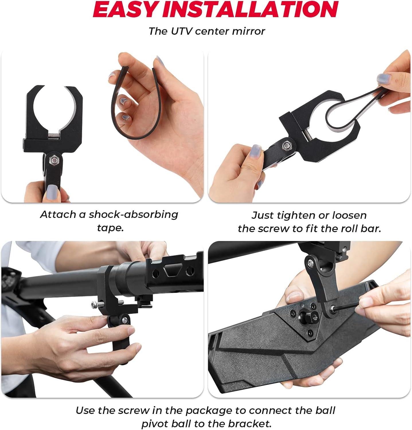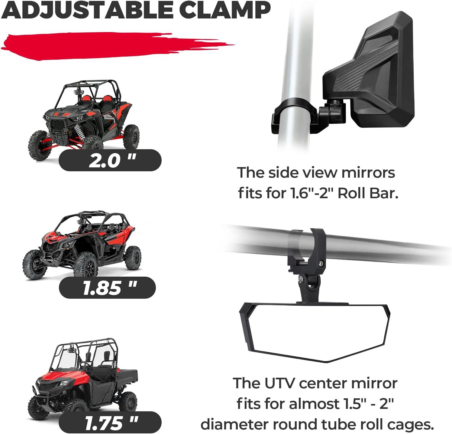 Compatible with Most UTV: No need to spend extra time searching for an intermediate mirror specific to your UTV. The UTV center mirror fits almost 1.5″ – 2″ diameter round tube roll cages. The side view mirrors fit for a 1.6″-2″ Roll Bar. Widely compatible with Polaris RZR, Arctic Cat Wildcat, Pioneer, CFMOTO, Mule, Teryx, Bennche Bighorn 700, etc. You only need to tighten the screw to match the size of the roll cage, take no more than 5 minutes to install easily