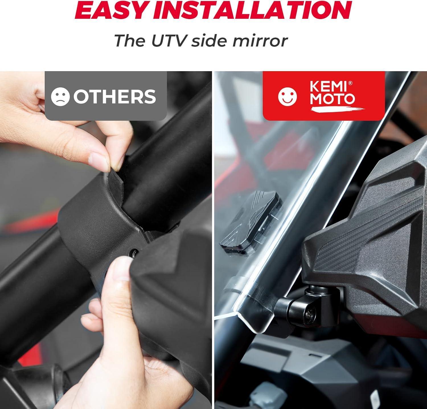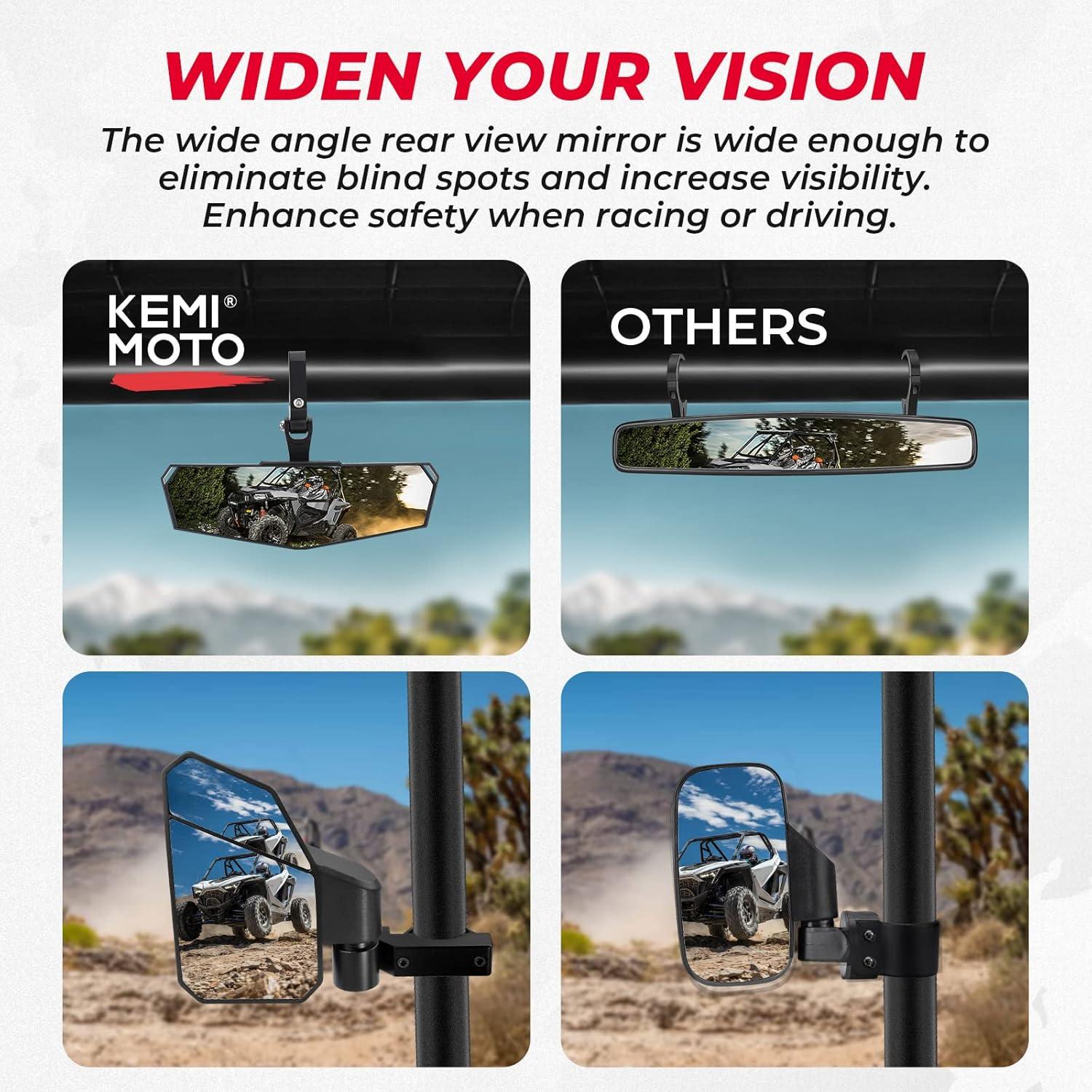Upgrade Combo Set: KEMIMOTO UTV side mirrors and KEMIMOTO UTV center mirror combo set. Widen your vision and provide perfect no vibration crystal clear great rear vision. All mirrors are compatible with the windshield, but side mirrors may require loosening the windshield screws for installation