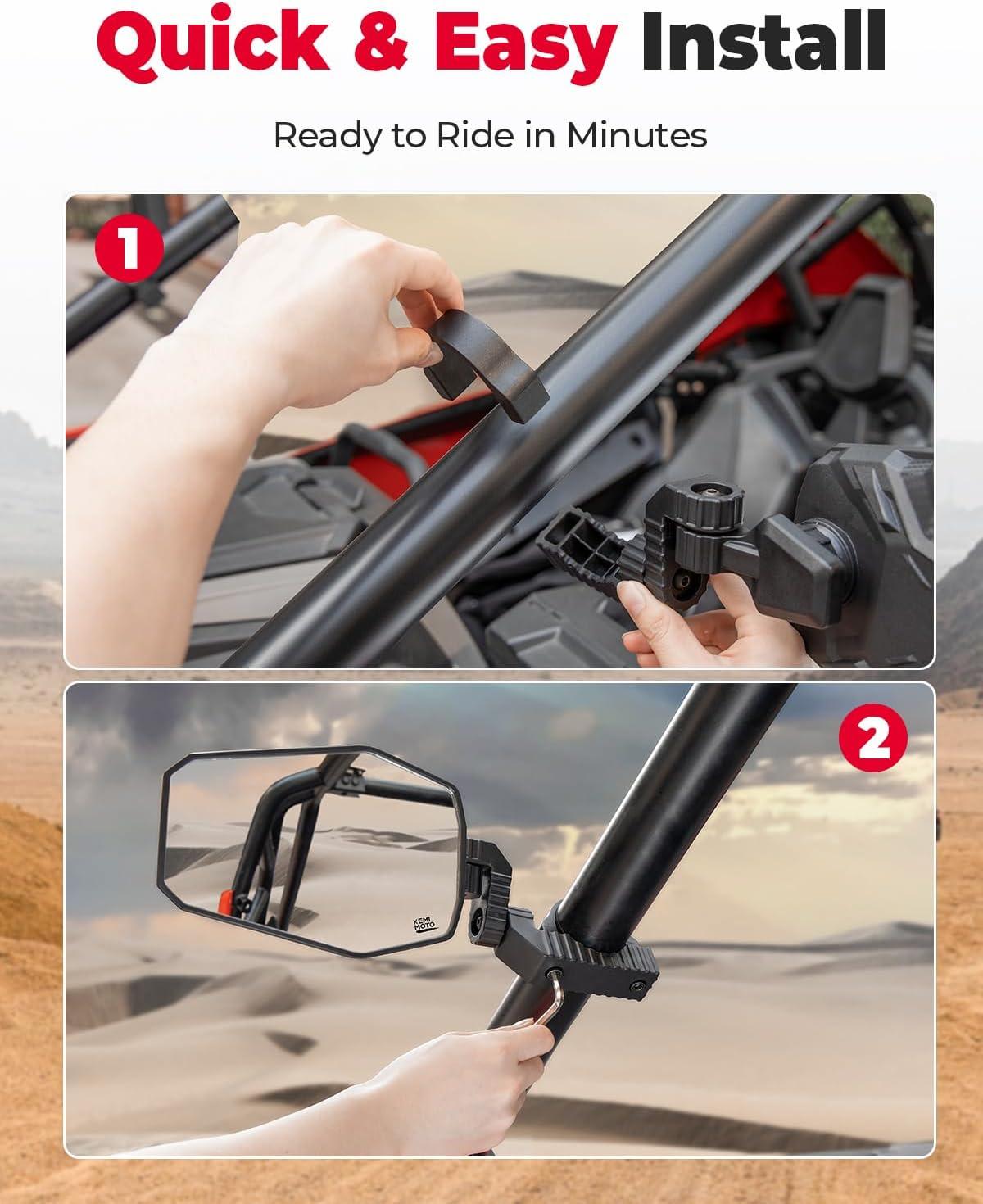 Easy Installation — KEMIMOTO UTV side mirrors are simple to install; just tighten the screws to secure them to the roll bar. Unlike others, our UTV rearview mirror can be adjusted after installation, eliminating repeat installation. We also provide rubber mats, which may assist your mirrors to stay in place and decrease noise while driving. If necessary, you may add it during installation