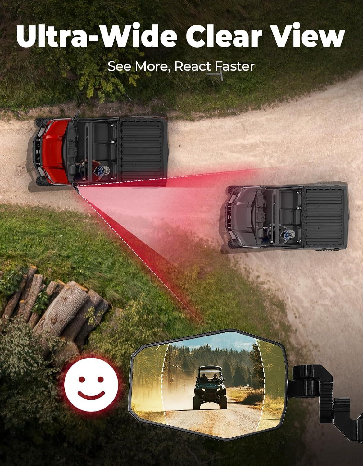 3 Adjustment Methods — These SXS side mirrors include three adjustable methods that allow you to simply modify the angle of the mirror to obtain the best sight, improve your driving pleasure, and guarantee your safety. Notice: this KEMIMOTO UTV side mirror owns a patented design