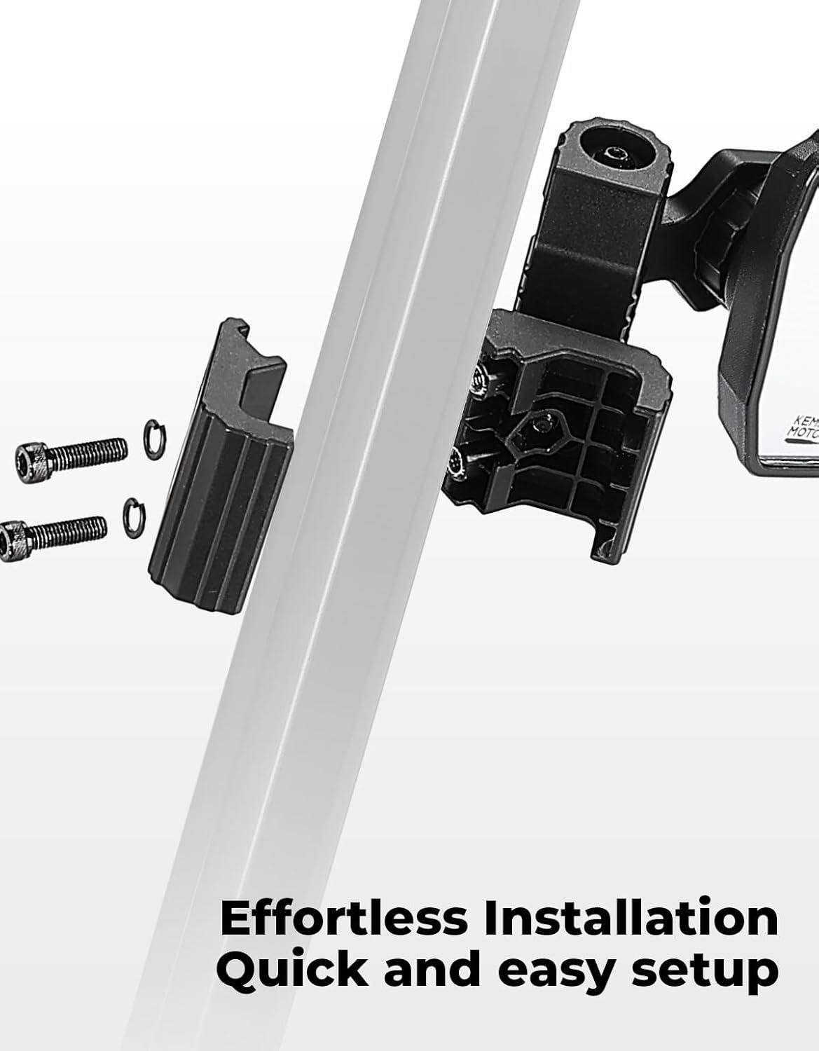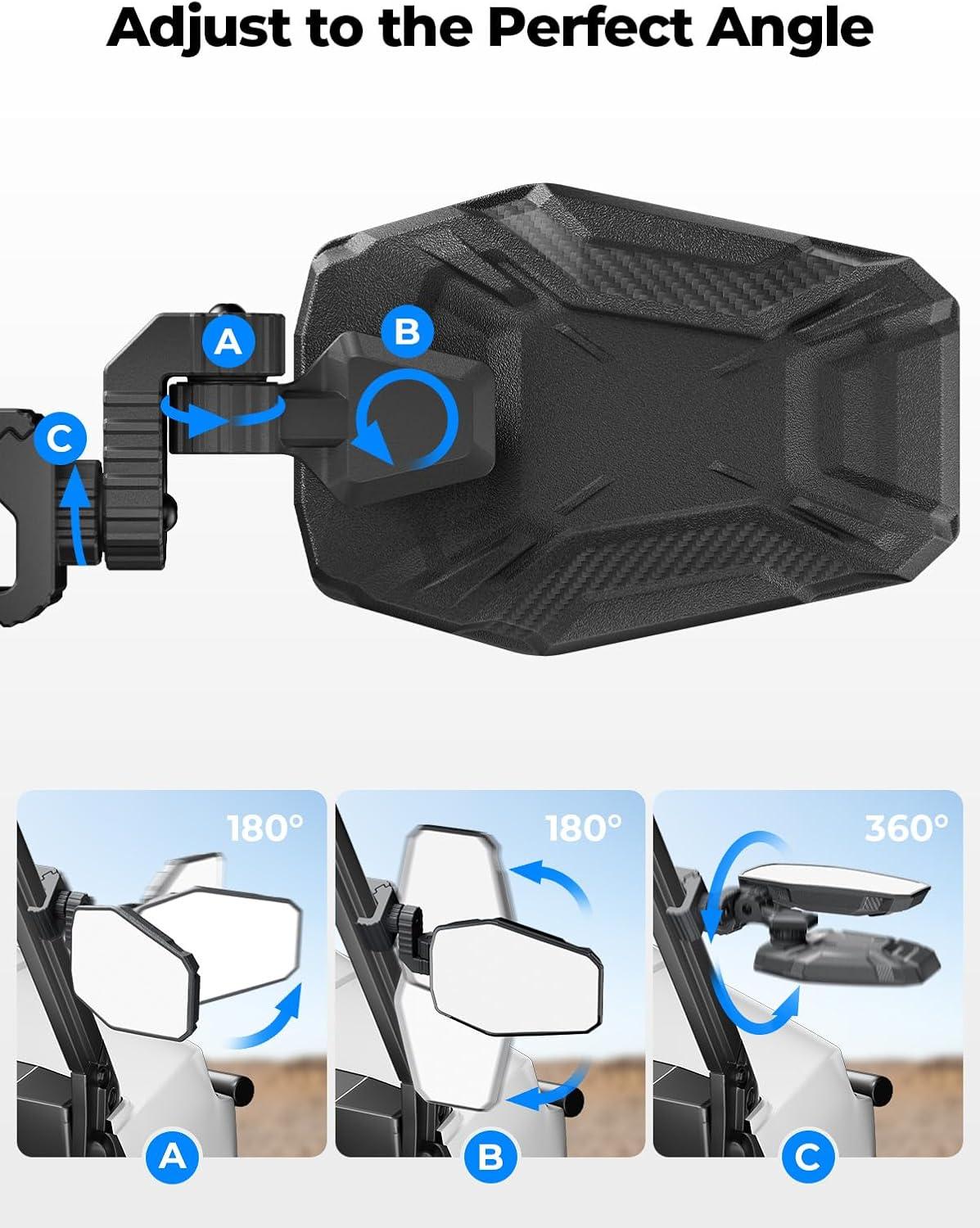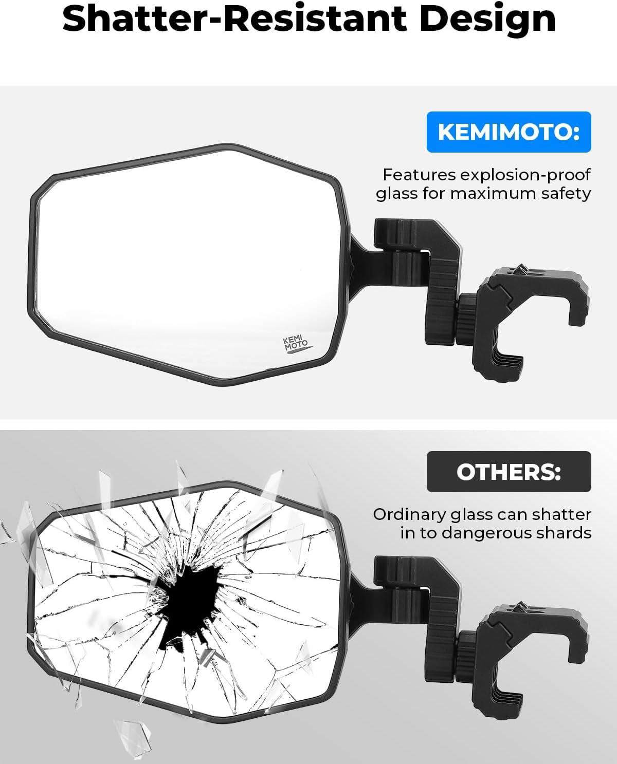 Upgraded 3-Axis Rotation: KEMIMOTO UTV mirrors feature 3-axis rotation to allow maximum adjustability. Ball-joint connector on the mirror bracket allows rotation to any desired angle and style. 2 axes on the mounting clamp provide vertical & horizontal adjustments