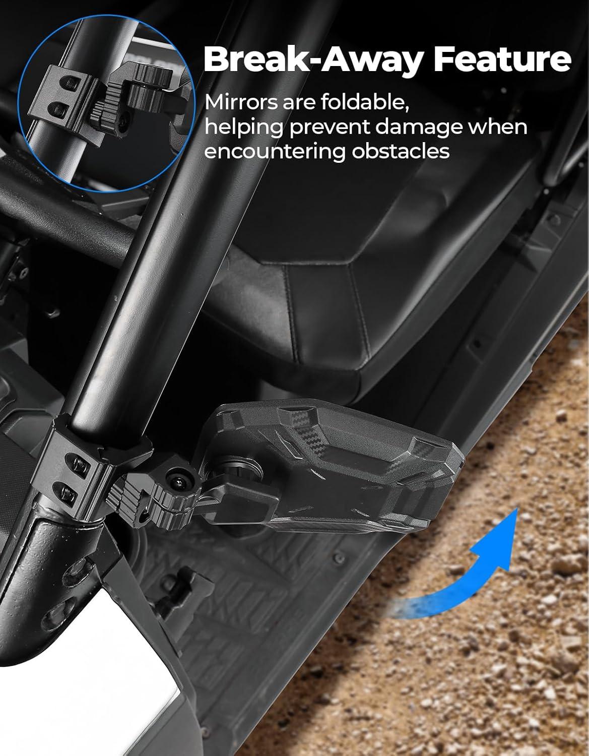 Breakaway and Splash-Proof: UTV rear view mirrors can be folded inward and avoid crushing when you encounter obstacles such as branches in the trail. Upgraded splash-proof lenses are not like other mirrors on the market that will splash and hurt people when broken