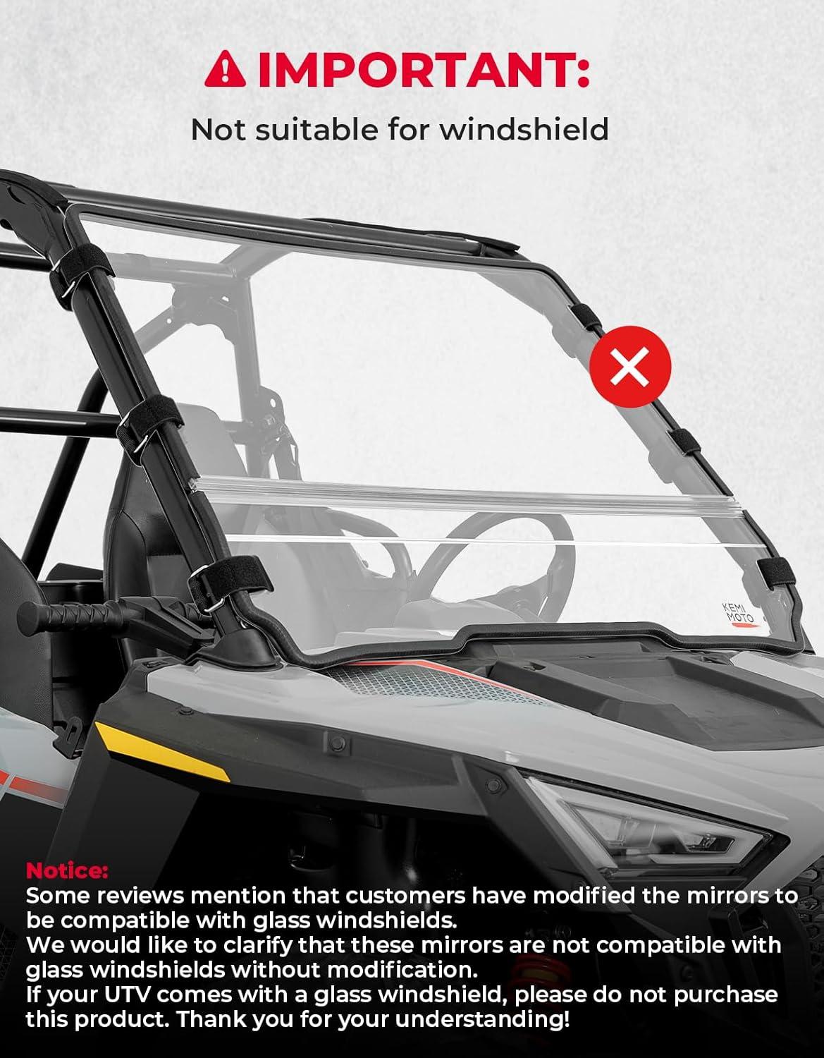 Pro-Fit Cage: UTV side mirrors are compatible with Polaris Ranger XP 1000/ XP 900/ 570 Mid-Size/ 500, General 1000/ XP 1000, Can-Am Defender, Maverick Trail, 2023 CFMOTO ZFORCE 800/950 Gen 2, UFORCE 600 / 1000, CF600/ CF500 w/Pro-Fit channel shaped bar. NOTICE: WILL NOT FIT FULL DOOR & WINDSHIELD. WILL NOT FIT ON A ROUND TUBE ROLL BAR. For a windshield-compatible design, go with the KEMIMOTO Newer Model Pro-Fit Side Mirrors.