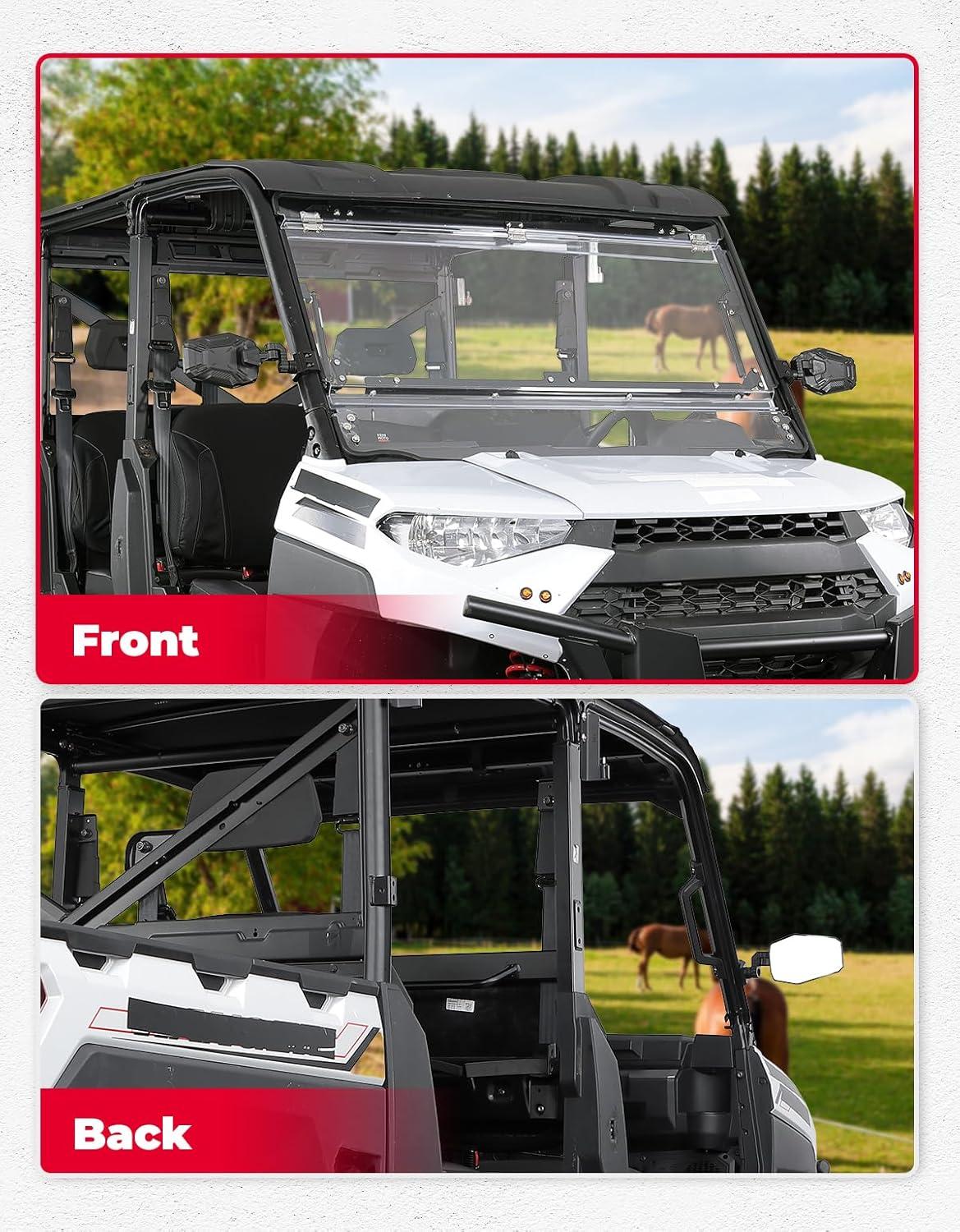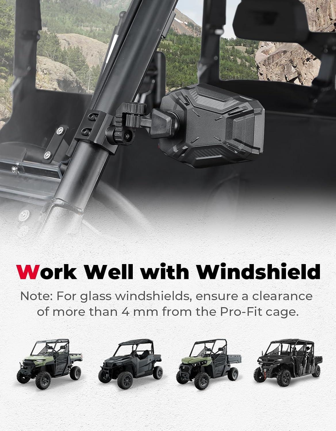 Windshield-Compatible Design: Special low-profile clamps provide full windshield compatibility. (Note: For glass windshields, ensure a clearance of more than 4 mm from the roll cage). UTV side mirrors are compatible with Polaris Ranger XP 1000/ XP 900/ 570 Mid-Size/ 500, General 1000/ XP 1000, Can-Am Defender, Maverick Trail, 2023 CFMOTO ZFORCE 800/950 Gen 2, UFORCE 600 / 1000, CF600/ CF500 w/Pro-Fit channel shaped bar