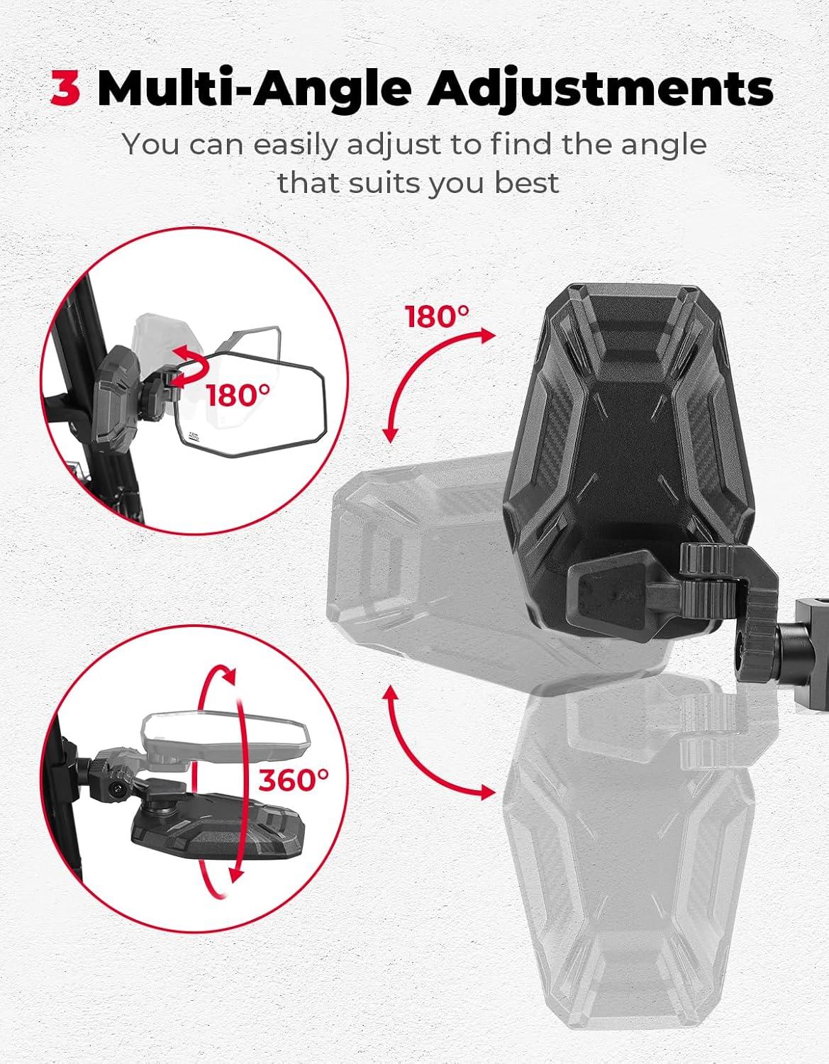 Upgraded 3-Axis Rotation: KEMIMOTO UTV mirrors feature 3-axis rotation to allow maximum adjustability. Ball-joint connector on the mirror bracket allows rotation to any desired angle and style. 2 axes on the mounting clamp provide vertical & horizontal adjustments