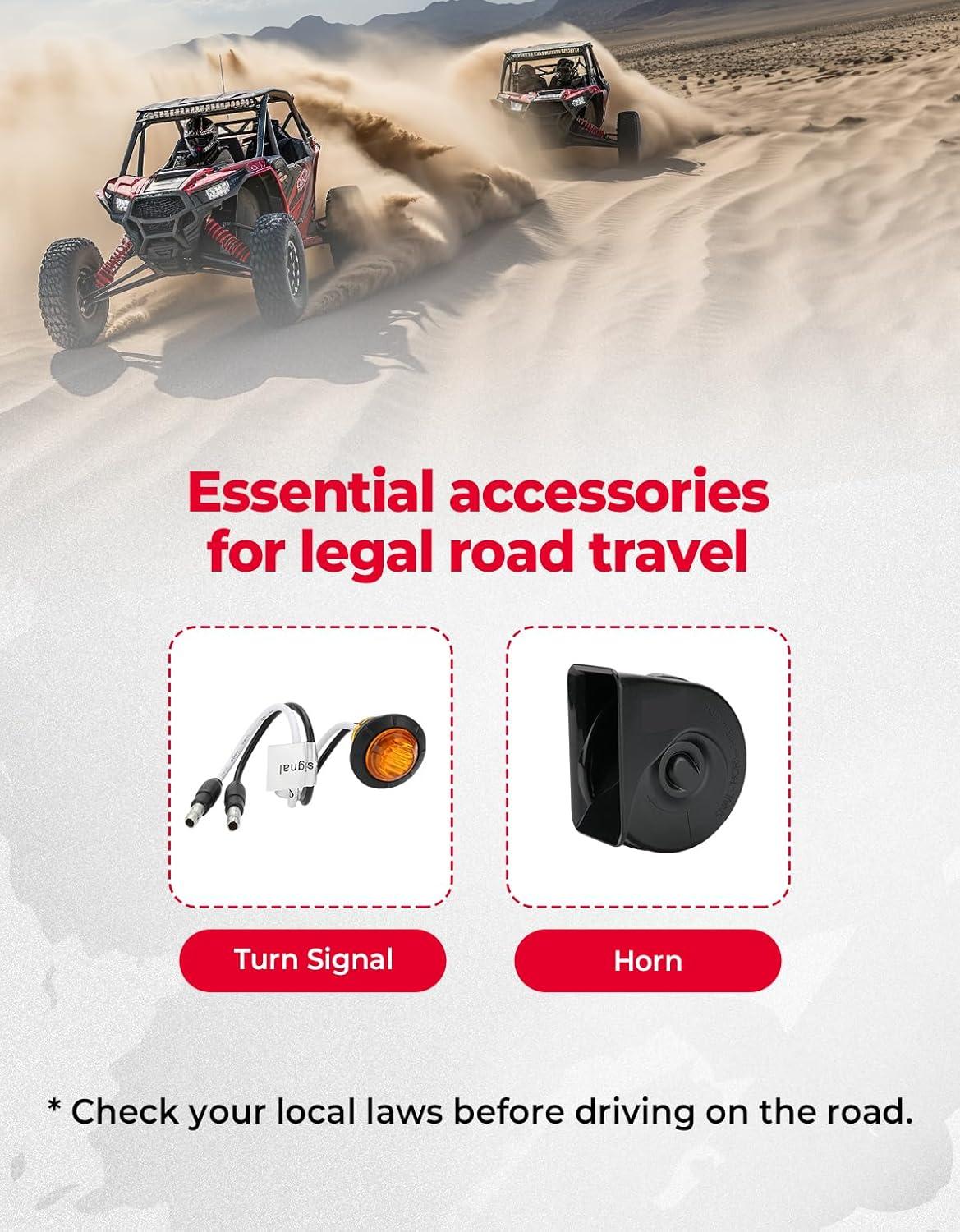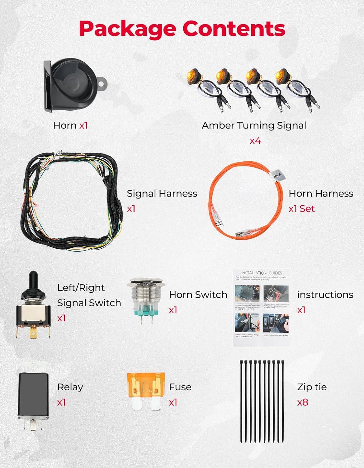 Essential Kit: Do you know what accessories are necessary for your UTV to be road-legal? Yes, a loud horn and turn signals are essential! This KEMIMOTO turn signal kit includes a horn and four turn signals; there's no need to buy them separately. Please check your local laws before driving on the road