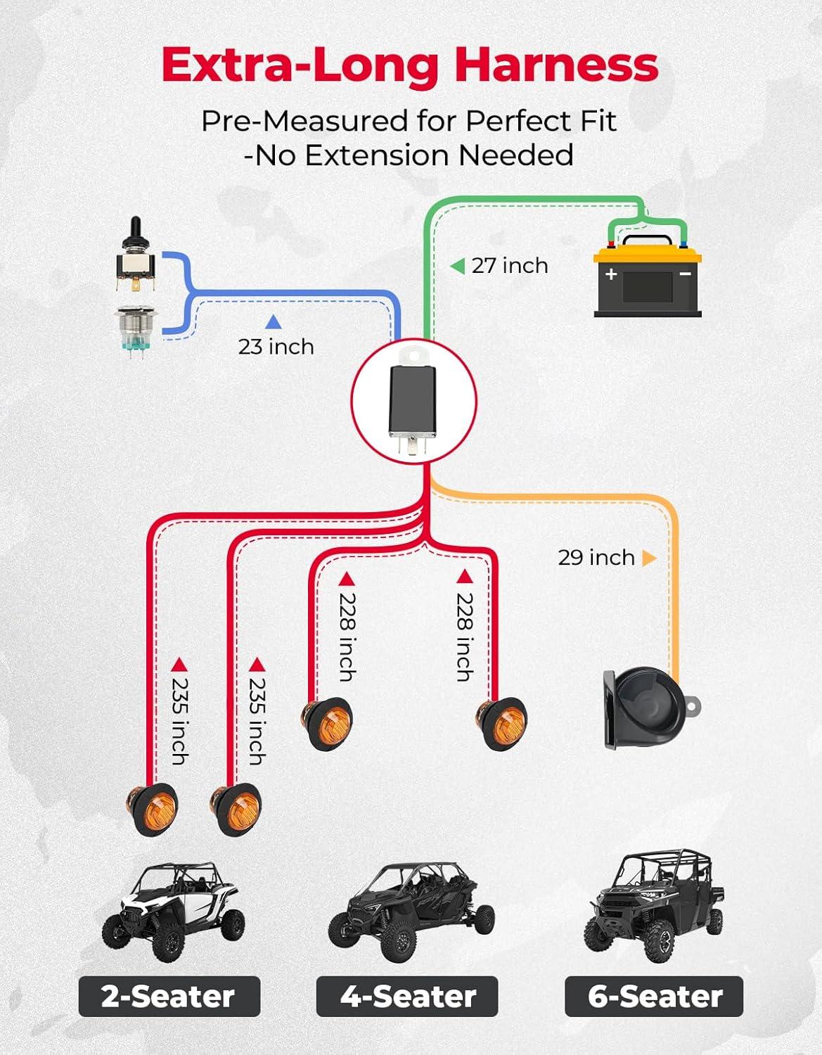 215 inch Long Wire Harness: The turn signal wire is 215 inches long and can be routed along the undercarriage of the vehicle, with 150 inches to encircle the base and an additional 65 inches to ensure reach to all light bulbs, perfect for both four-seater and two-seater vehicles