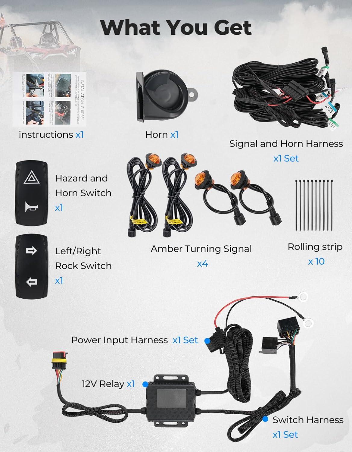 Upgraded Wire Harness Length: The KEMIMOTO turn signal kit comes with an upgraded wire harness length that can accommodate vehicles up to 220 inches long. Color lines are marked on the corresponding installation location, making installation more efficient. The kit includes all necessary accessories, including amber turning signal lights x4, 110db horn x1, left/right rocker switch x1, hazard, horn switch x1, harness set x1, relay x1, nylon cable ties set x1, and an installation guide x1