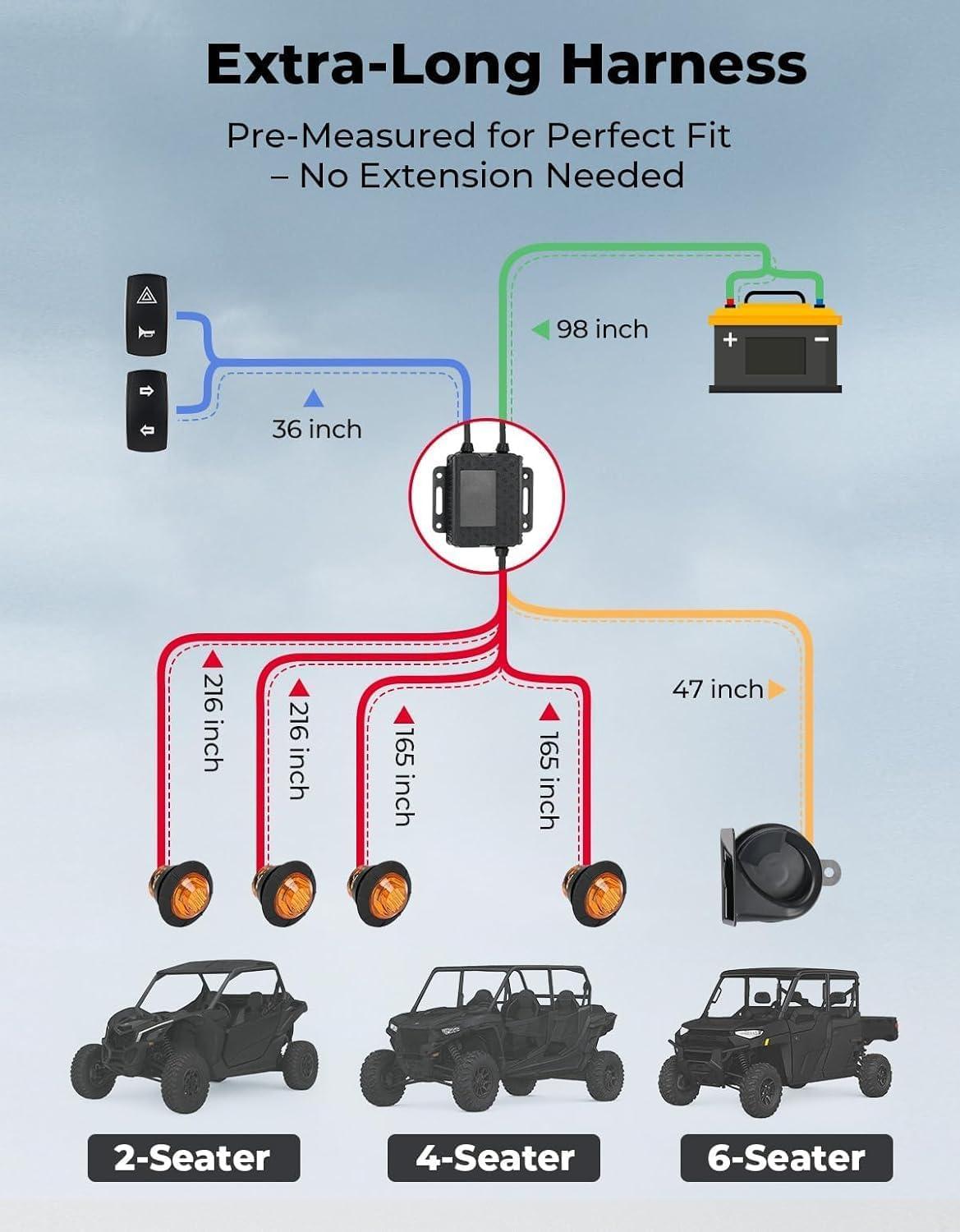 Universal Compatibility: Our street-legal turn signal kit is designed to fit a wide range of vehicles; it is compatible with Polaris RZR Ranger, Pioneer, Talon, Can-Am X3, Kawasaki Teryx Mule, Arctic Cat, CFMOTO, Golf Cart, LandMaster, Segway, and more. With our kit, you can easily make your vehicle street-legal and improve safety on the road