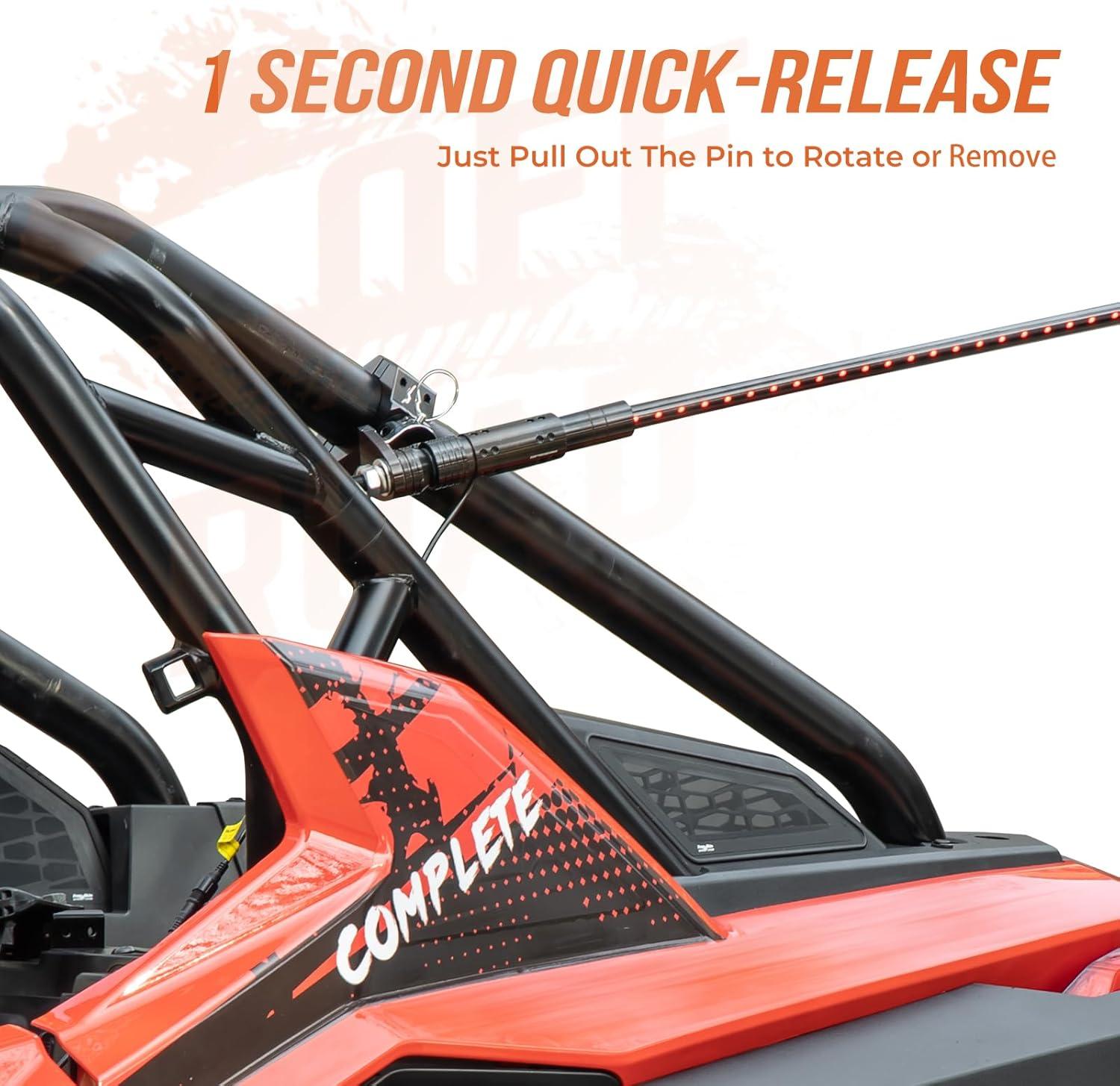 Function: A flag or whip light can be mounted by kemimoto mount on your UTV roll bar that will give attention to other riders to know that you are on the track, trail, or dune. In addition, the direct bolt-on and quick-release design allows you to take your whip light or flag off easily by removing the R pin when you come across some obstacles while you are on riding such as branches or some places where limited height.