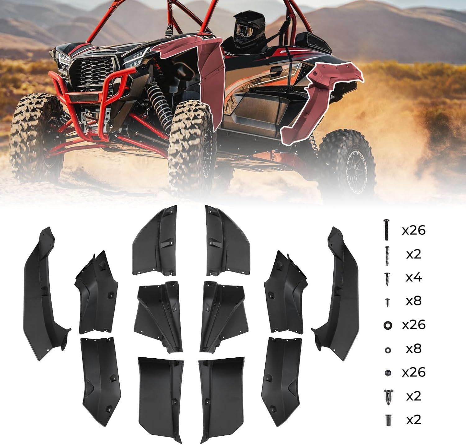 GREAT COVERAGE: KEMIMOTO front fender flares mud guards can provide 8.97 inches of additional coverage above your front tire. Rear fender flares for UTV will add 7.8 inches of additional coverage above your rear tire. Heavy-duty mud flares can effectively prevent mud from entering the cab and windshield, KEMIMOTO flares will keep the interior of your vehicle clean