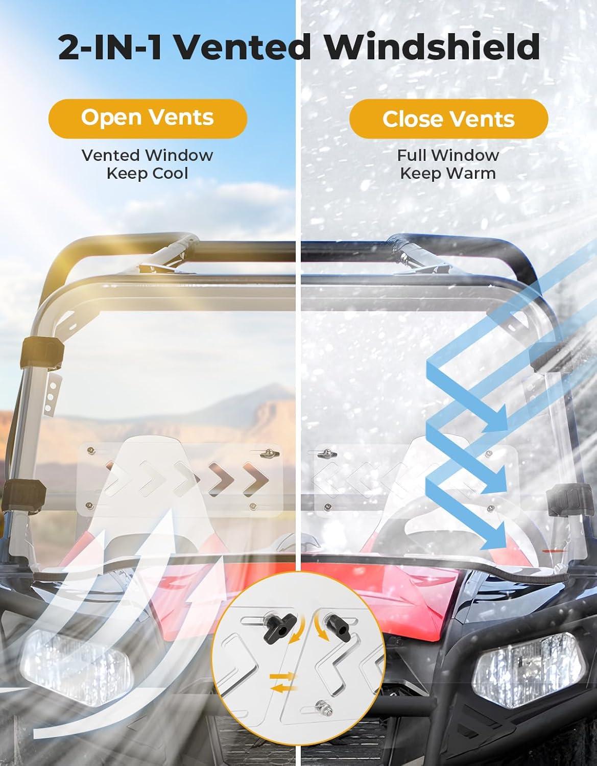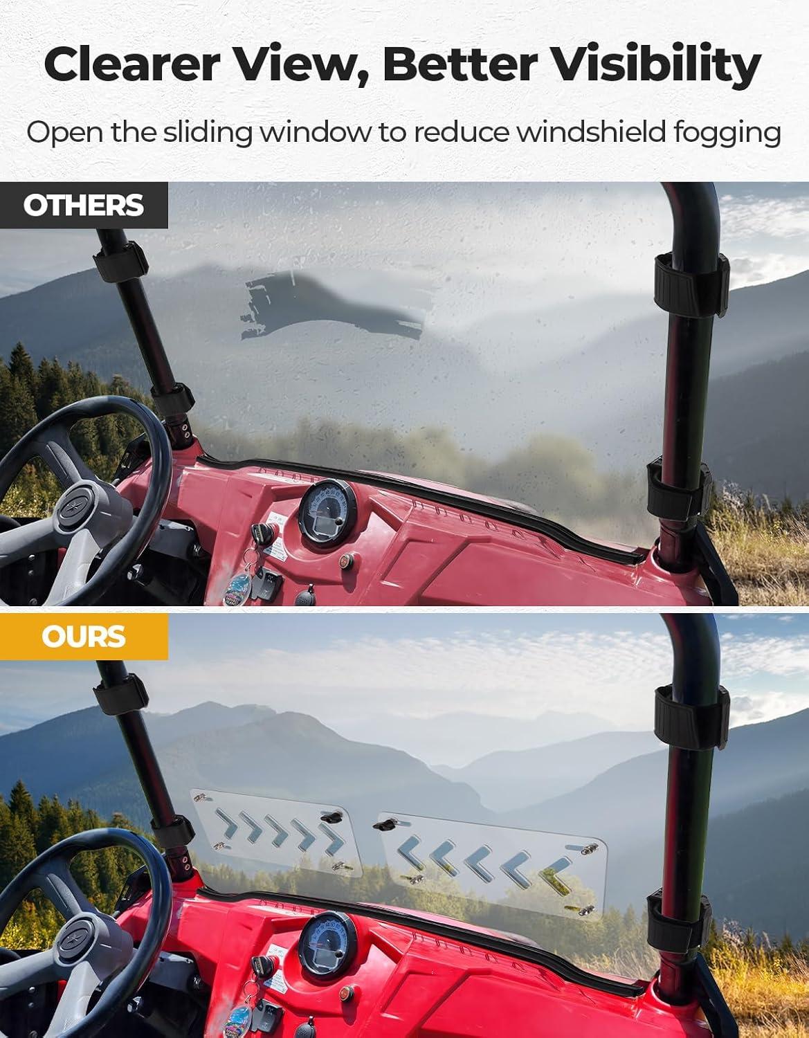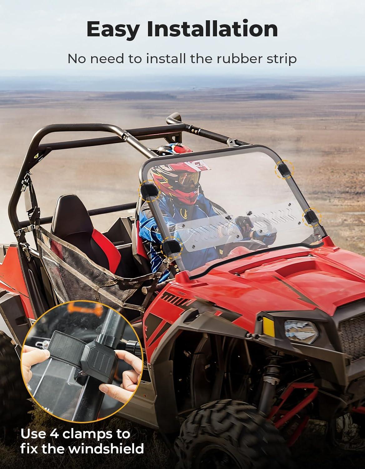 Easy Installation & Good Sealing: No extra tools are required for installation. The strap clamp design makes the windshield easy to install and remove without leaving any marks on your UTV. The rubber strip provides excellent sealing to prevent rainwater from getting in and also helps protect the body of your UTV from scratches