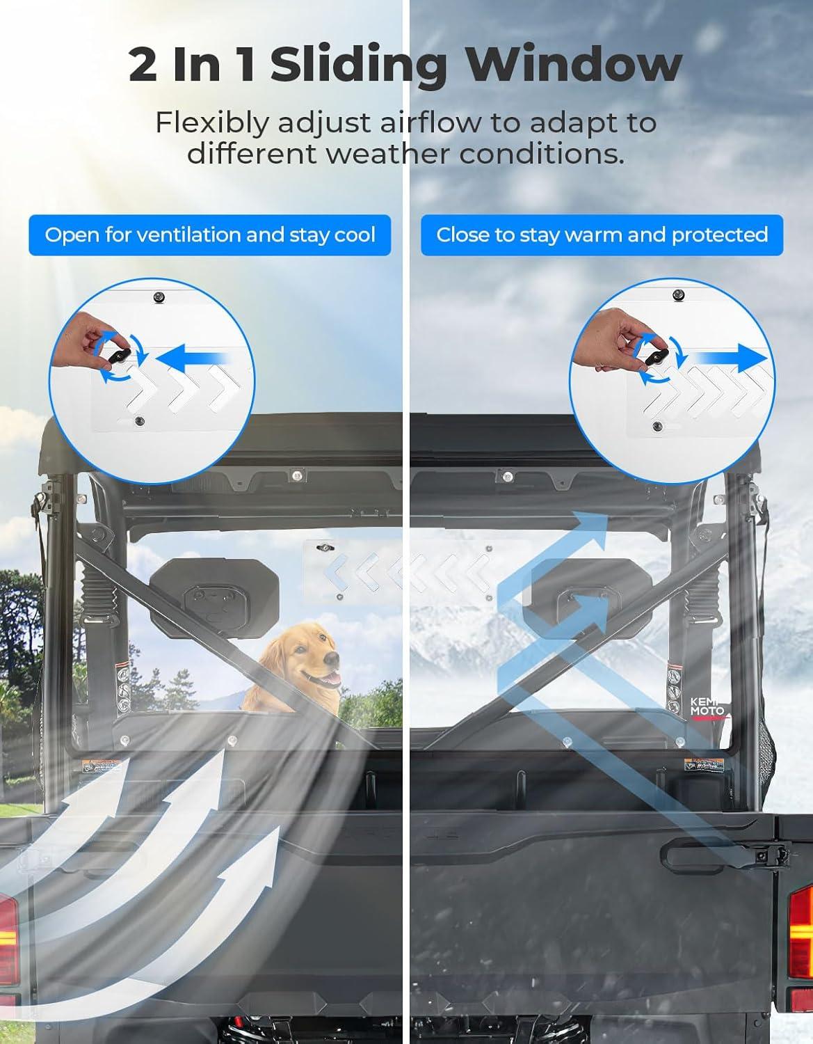 Ventilation and Defrosting: KEMIMOTO rear window features sliding vents to ensure proper airflow. It offers the advantages of both full and half windshields, delivering complete protection while allowing ventilation. Get ready for a more comfortable and enjoyable adventure