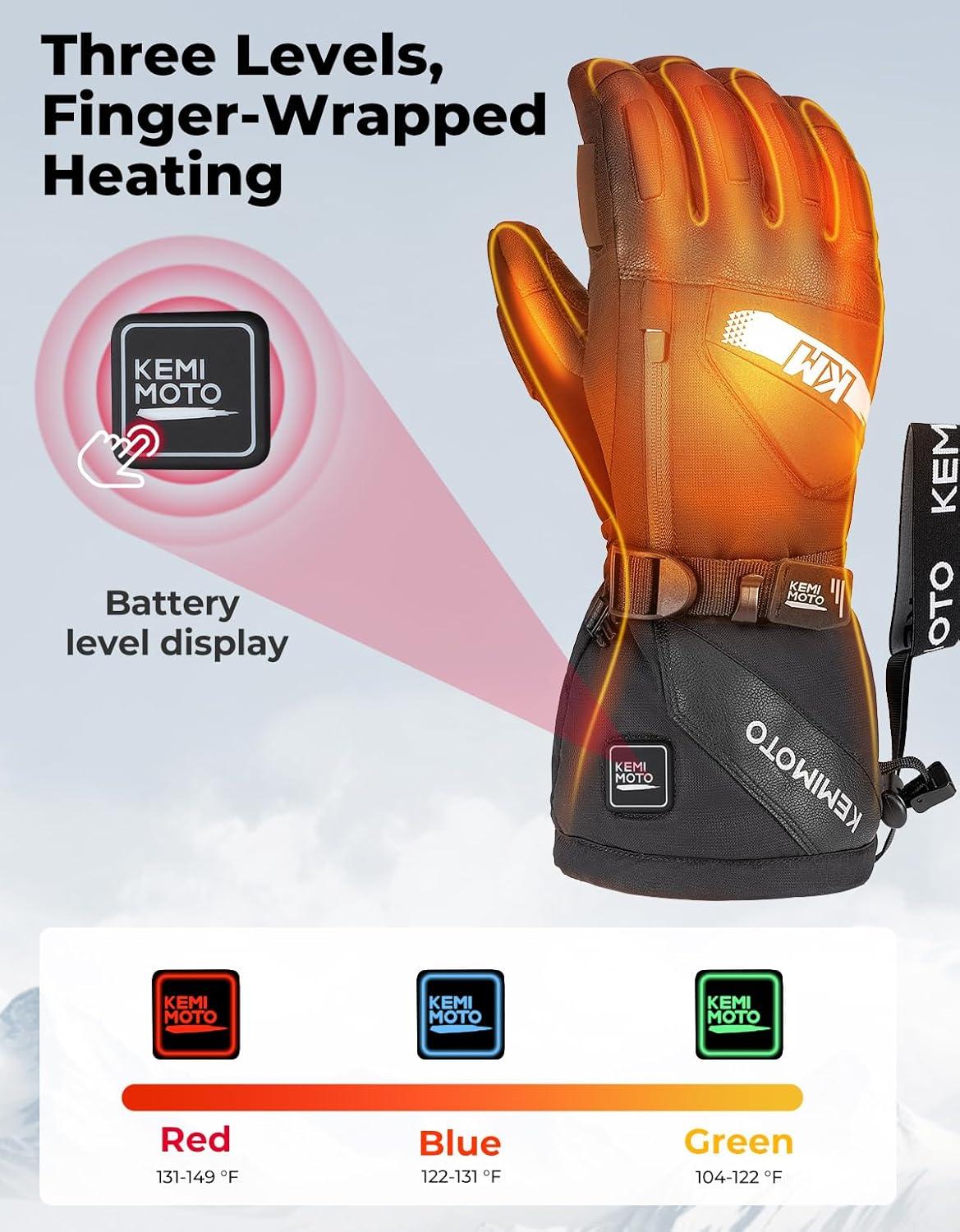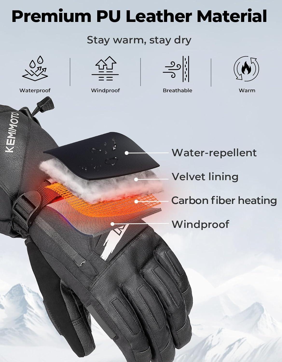 FINGERTIP WARMTH: Featuring advanced microwire heating, our heated rechargeable gloves men produce warmth ( 3 button settings – 104°F to 149°F) throughout electrical gloves, including every fingertip, The PU waterproof gloves winter are backed by layers – waterproof, winter water-repellent, insulation, velvet lining, to retain heat and keep out the elements. These snow gloves are great for people in the cold
