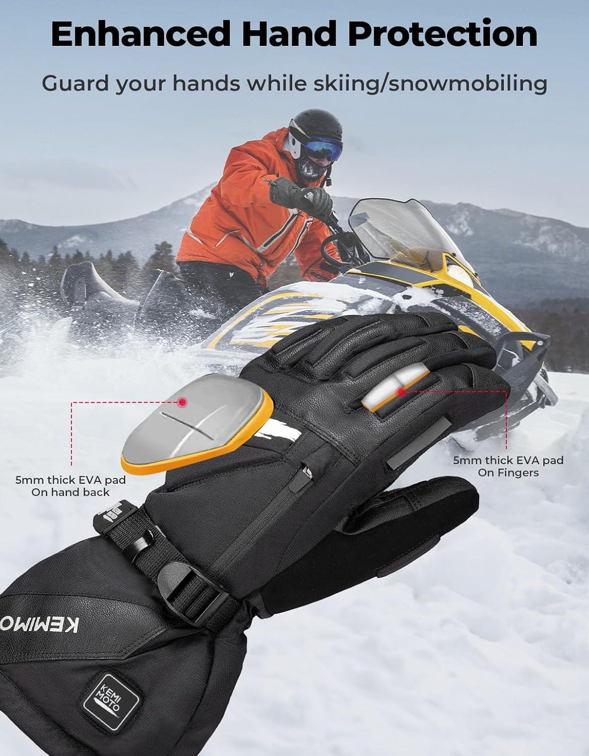 CONVENIENT FEATURES: Stay connected with 3-finger TOUCHSCREEN compatibility, 2 ZIPPERED POCKETS for essentials, 2 ANTI-LOST wrist leashes, REFLECTIVE strips, ANTI-SLIP padding PU palm for added protection. The battery heated gloves men rechargeable are functional to withstand much wear and tear in snowboarding/snowmobile/skiing and offer you the most efficient protection