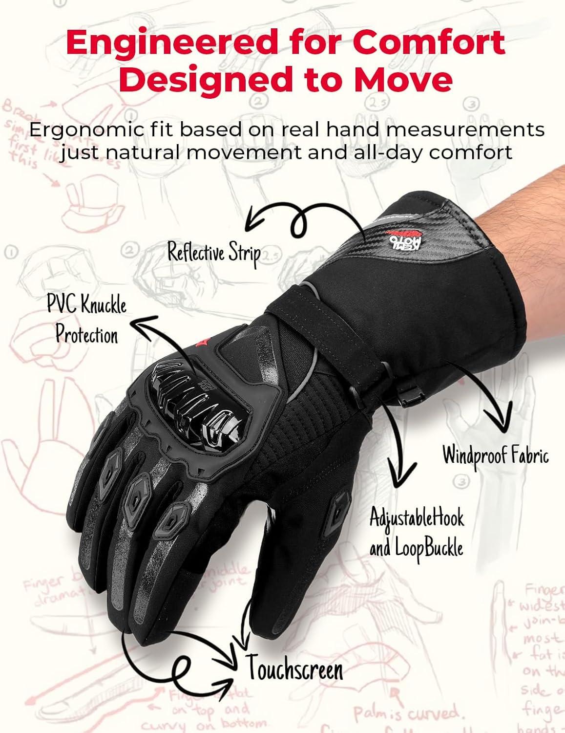 Rainproof And Warm: The motorcycle gear is made from 4 layers, velvet inner lining, thinsulate lining, a waterproof layer, and a windproof layer. So the winter gloves for men can resist getting wet and keep your hands warm and dry while driving in winter. The elastic band is used to keep warm and resist the wind. No more cold hands while riding