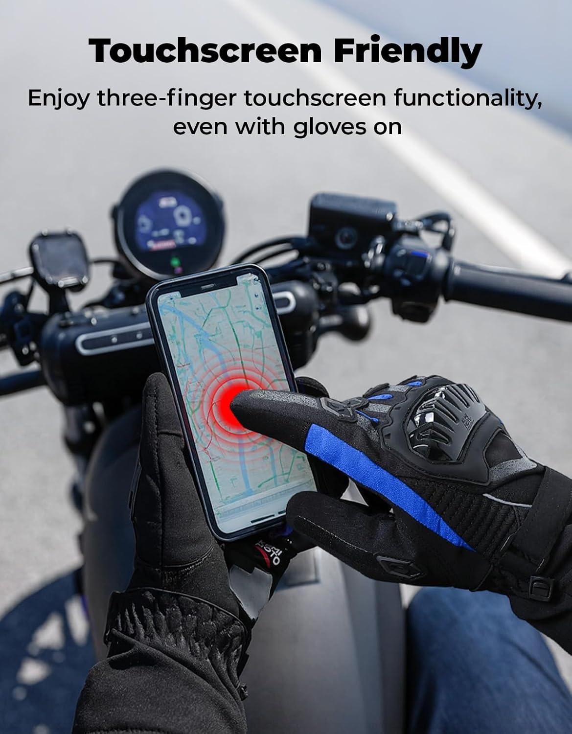 Three Fingers Touchscreen: The tip of the forefinger, middle, and thumb of the winter motorcycle gloves are made from conductive touch screen leather. So you can do everything without restriction, even if you wear gloves, you can still use the mobile phone or navigation device easily