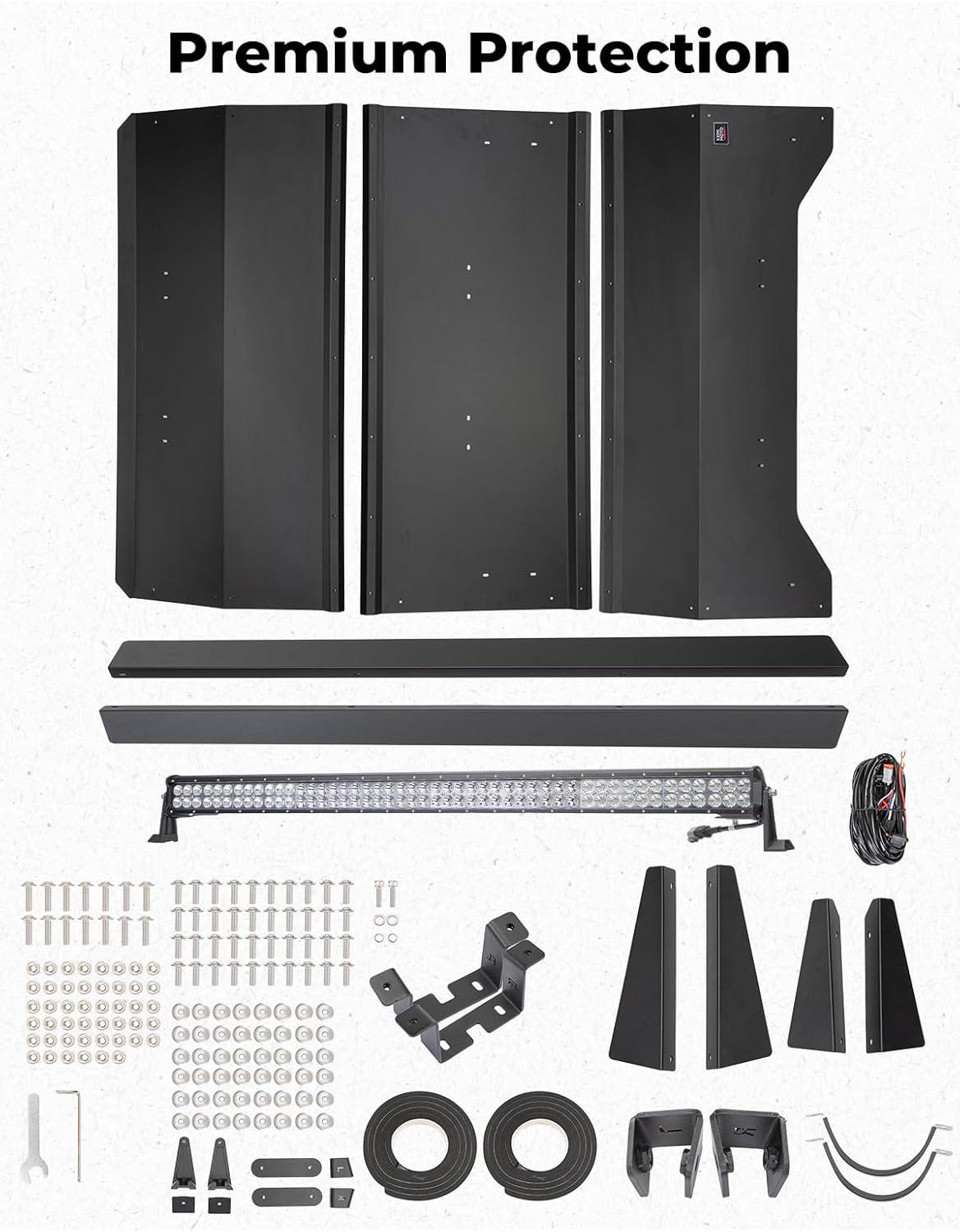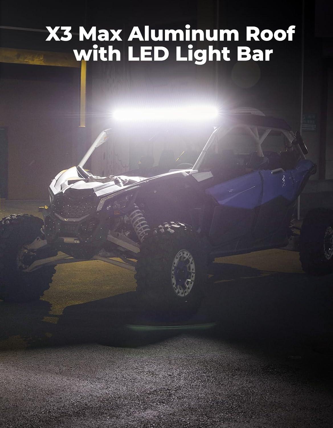Complete X3 Max Roof Kit: Package includes x3 max aluminum roof, 44″ LED light bar, a pair of upper roof brackets, 1 rocker switch wiring kit. No extra parts or complex wiring needed – everything ships as a ready-to-mount system