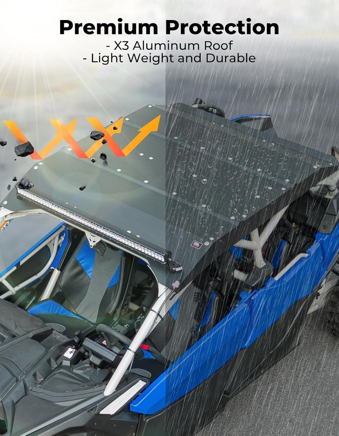 Lightweight Aluminum Roof: x3 max roof is made of 2 mm aluminum with black powder coating, making it impact-resistant, corrosion-resistant, and durable. The metal material better protects the driver and passengers from wind, sun, rain, branches, debris, etc., providing a safe driving experience and keeping the cab clean. Besides, The x3 roof is equipped with rubber pads to prevent direct contact between the roof and roll bar, reducing noise and preventing potential damage during driving