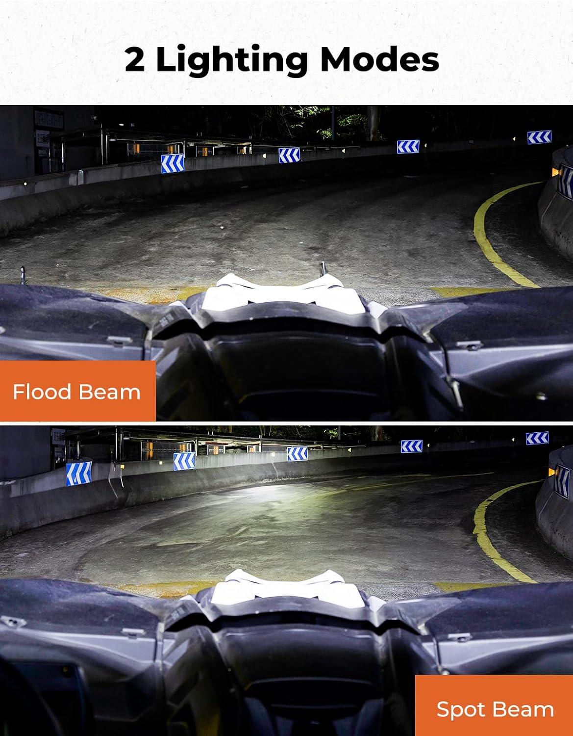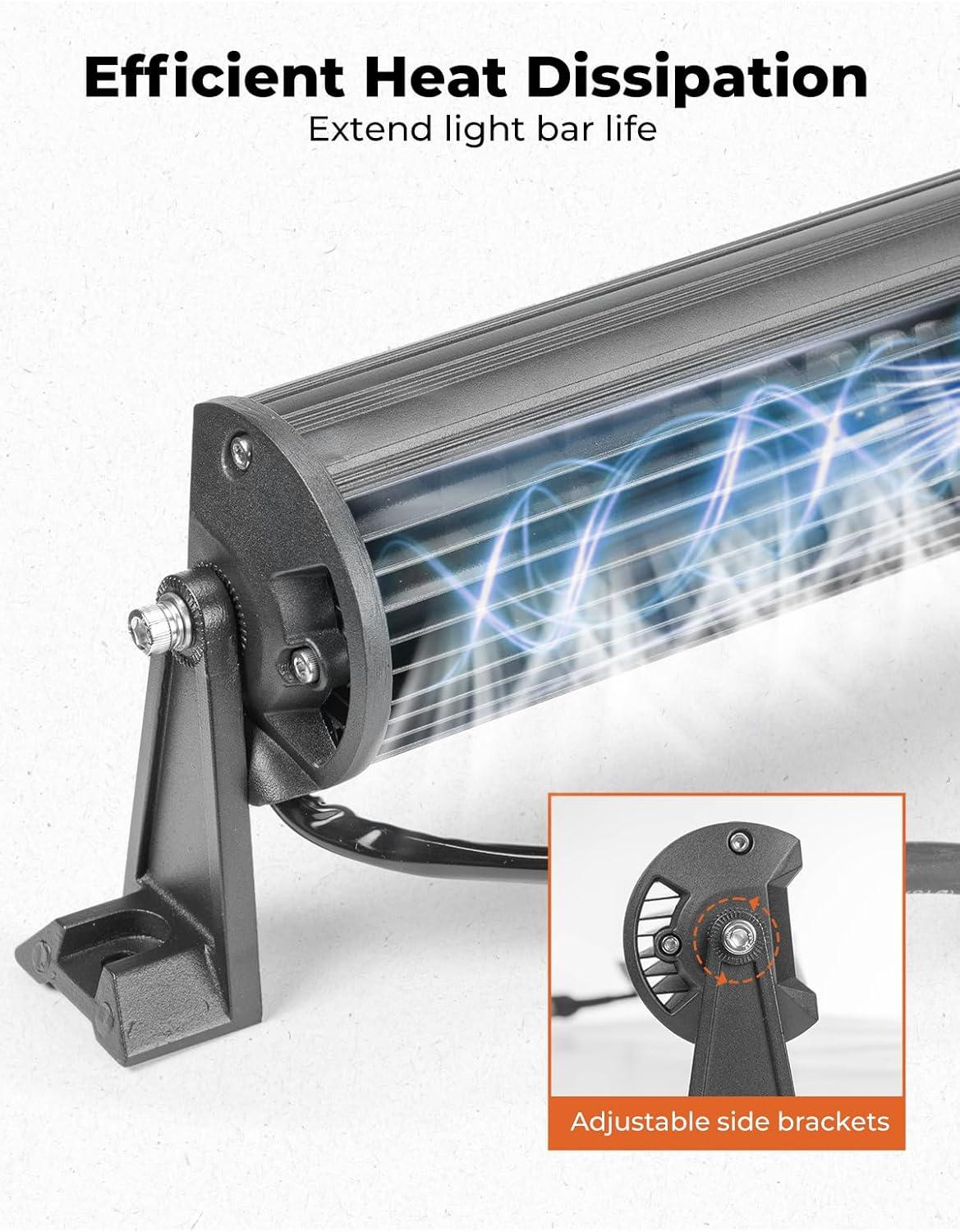 Dual-Mode LED Light Bar: This spotlight provides bright white illumination with 2 lighting modes: floodlight for wide coverage and spotlight for focused beams. Designed with a rear heat sink featuring 5mm fin spacing, it effectively dissipates heat, enhancing durability and lifespan. The adjustable bracket has gears, which not only ensures a firm installation, but also allows you to adjust the lighting angle conveniently