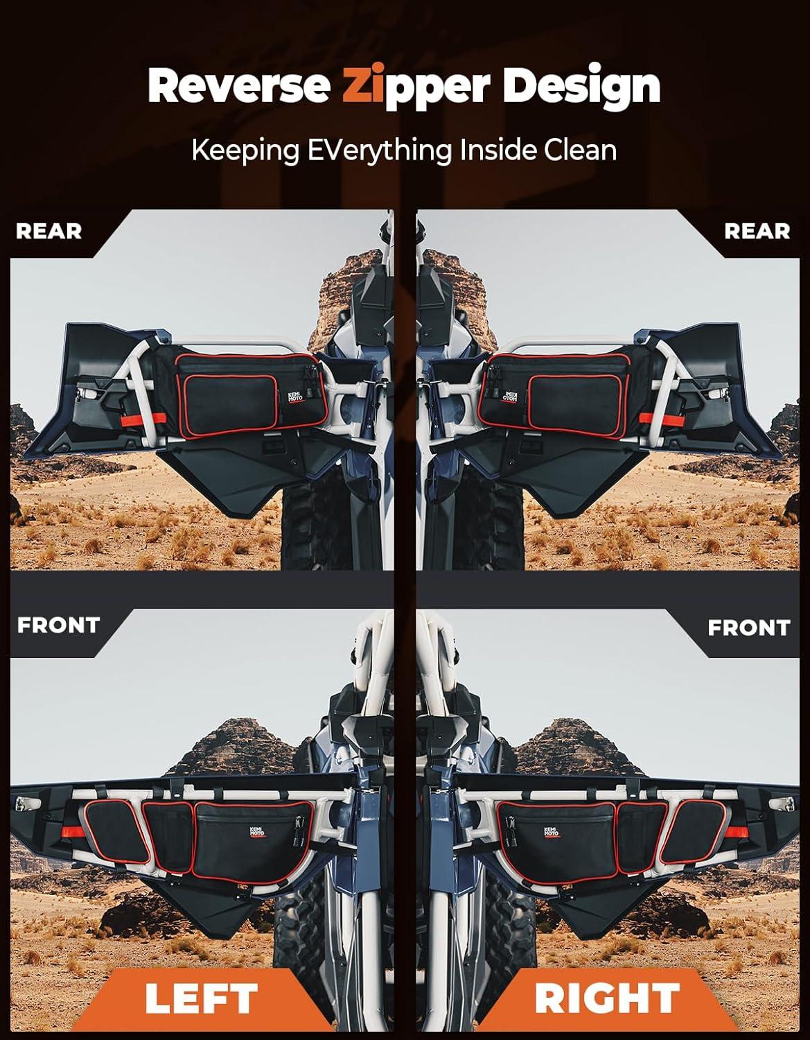 WHAT YOU GET: 1 pair of front upper door bag, 1 pair of front lower door bag, and 1 pair of rear upper door bag.