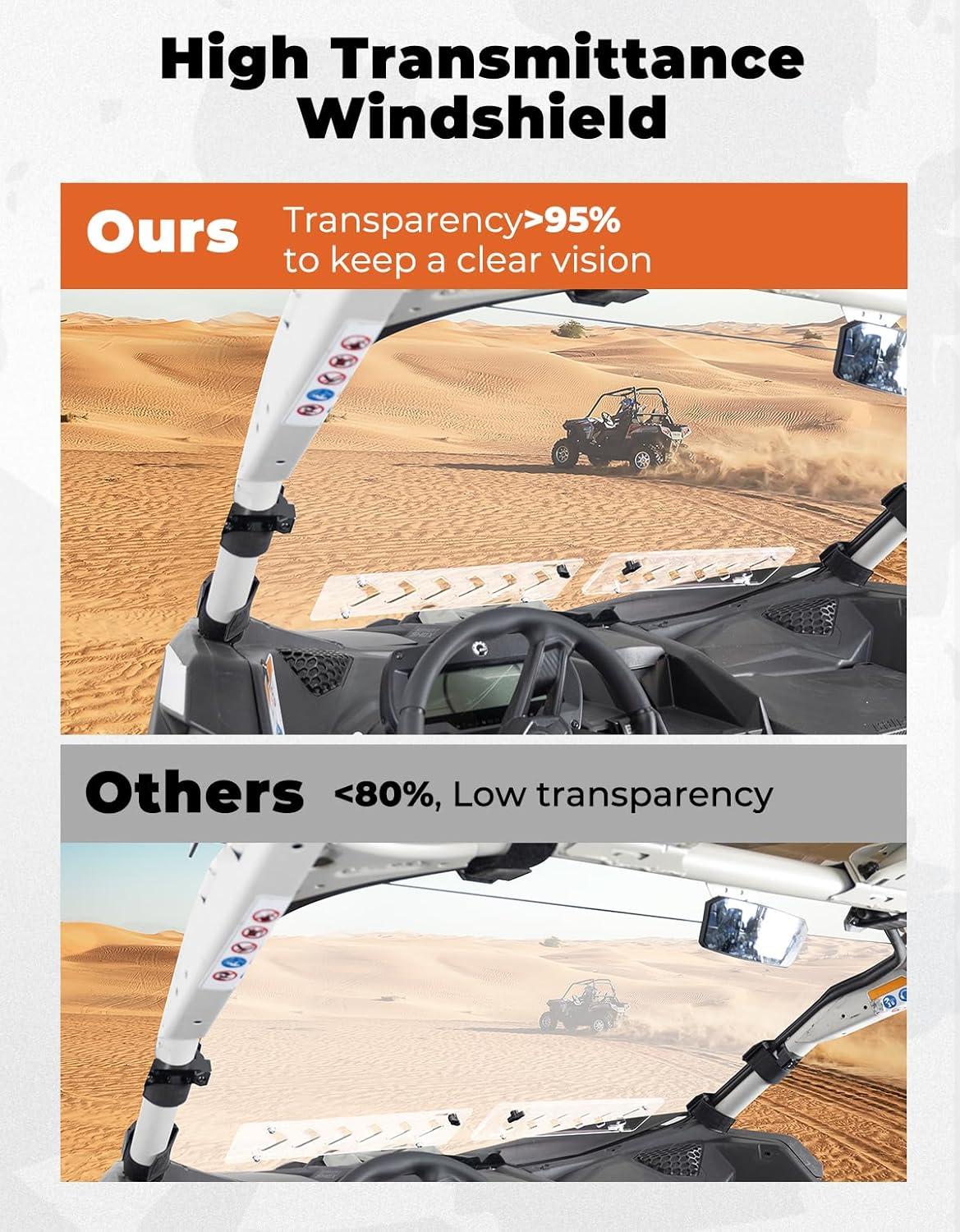 High Transparency Windshield: The x3 clear full windshield is made of injection-molded polycarbonate has a better light transmission (rate of 95% and up) than many kinds of glass and will provide a clear view