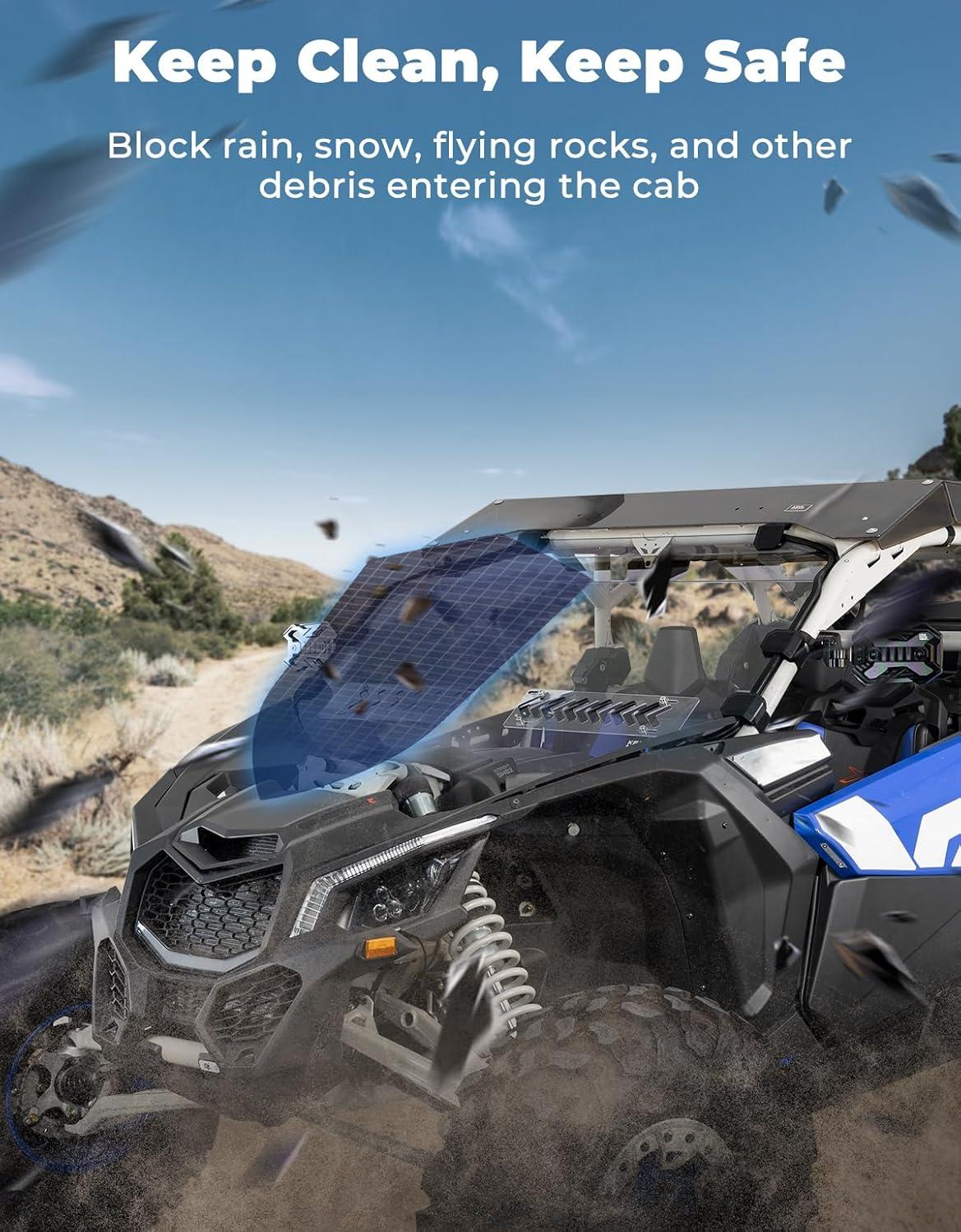 Great Protection: The KEMIMOTO X3 front windshield is designed to provide superior protection from the wind, rain, and debris while driving. Polycarbonate construction provides sufficient sun protection and ray protection, providing shade and protection, enhancing your outdoor experience, and ensuring the safety of your outdoor time