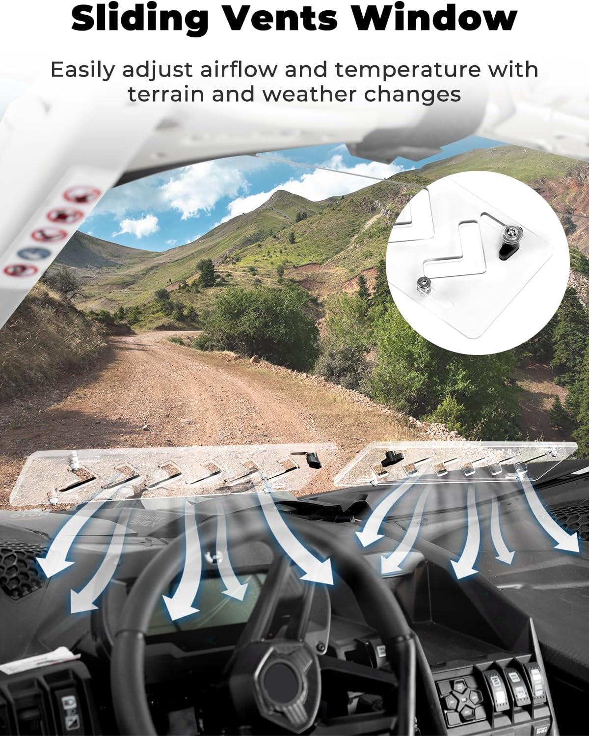 Fitment: The KEMIMOTO vented front windshield is compatible with Can Am X3 (2-seater) and X3 MAX (4-seater) 2017 2018 2019 2020 2021 2022 2023 2024 2025 all Models, such as 2018+ Maverick X3 900, 2017+ Maverick X3 /Max/ Turbo/R, 2018+ Maverick X3 X Turbo/ R, 2017+ Maverick X3 Xds/ Xrs. Please Note: DO NOT WORK WITH INTRUSION BAR