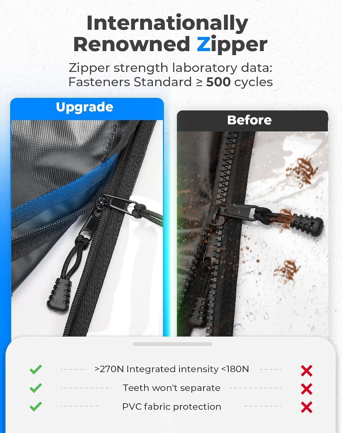 Zipper Design: Ventilation inside the vehicle can be easily achieved through the zipper. The fabric covering the zipper maximizes protection from mud and rain, extending the life of the zipper