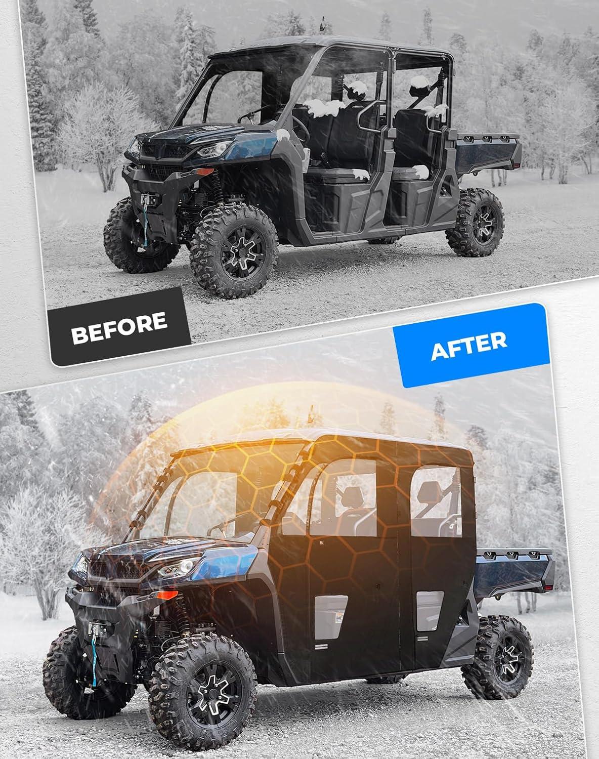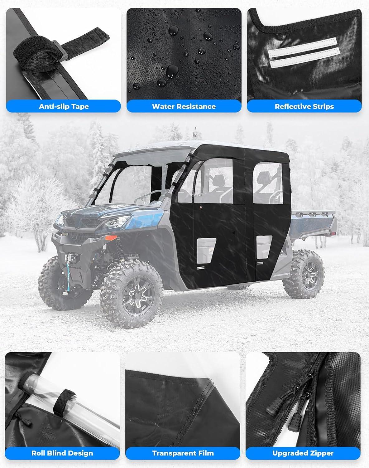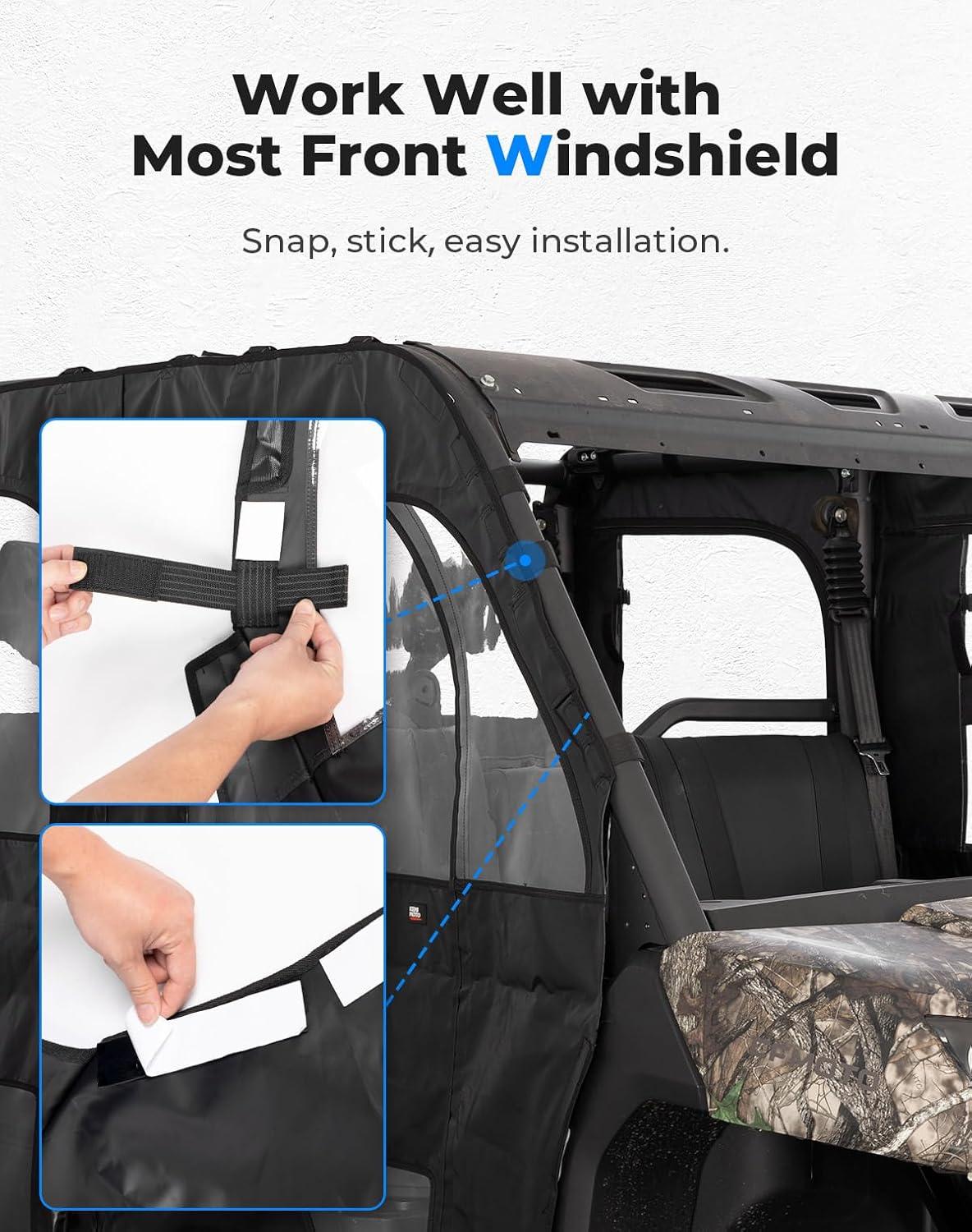 No-drilling Installation: Soft cab enclosures are not needed to drill and specialized tools. Just tie wrap around the door, then tear off the white paper and stick it on the door panel. The enclosure kit is compatible with 2022 2023 2024 2025 CFMOTO Uforce 1000 XL
